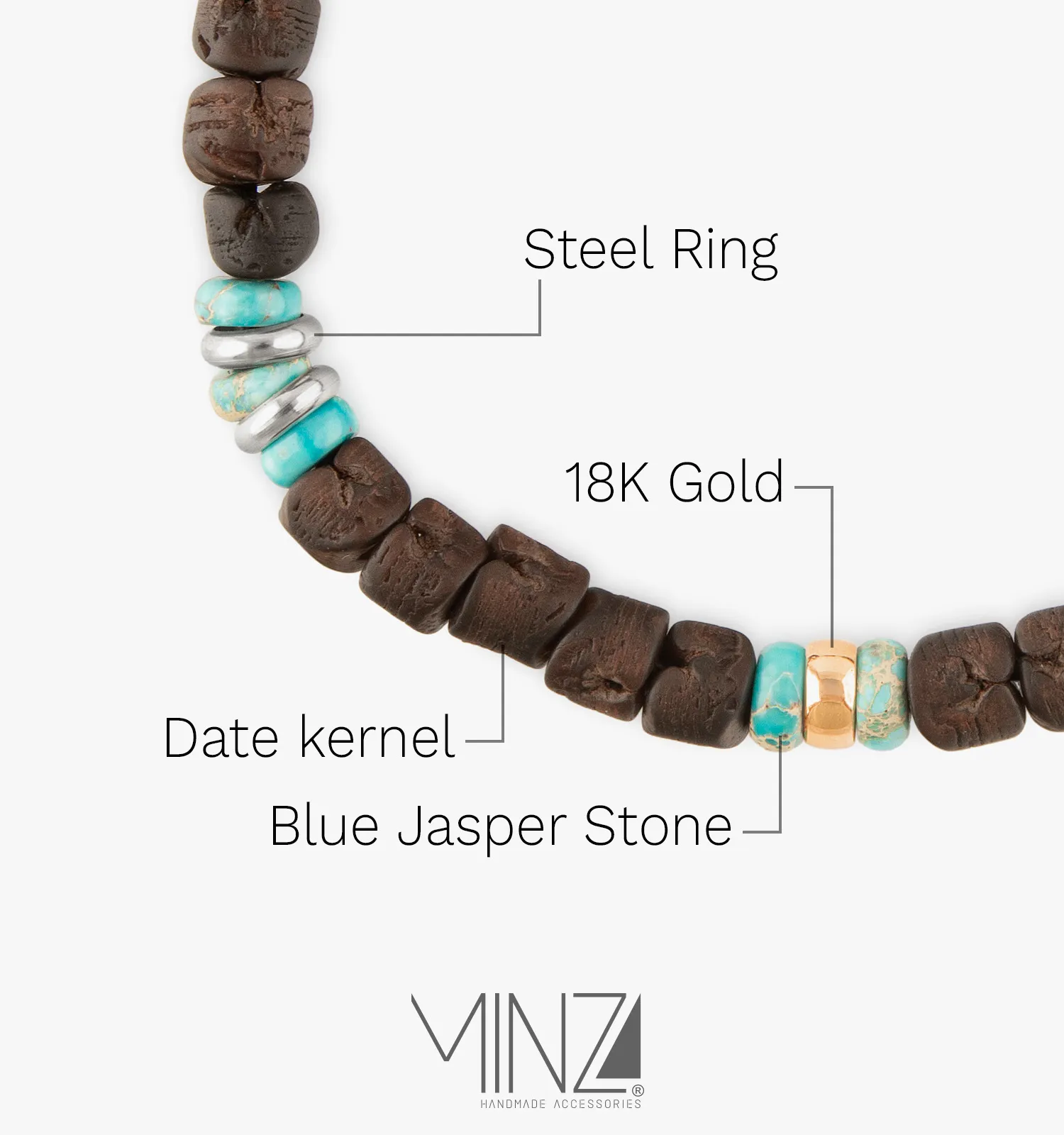 - Gold is traditionally believed to promote vitality, emotional balance, and inner strength. Turquoise jasper symbolizes grounding, protection, and stability. Date pits represent heritage, endurance, and connection to nature. Together, these elements reflect confidence, resilience, and natural strength.