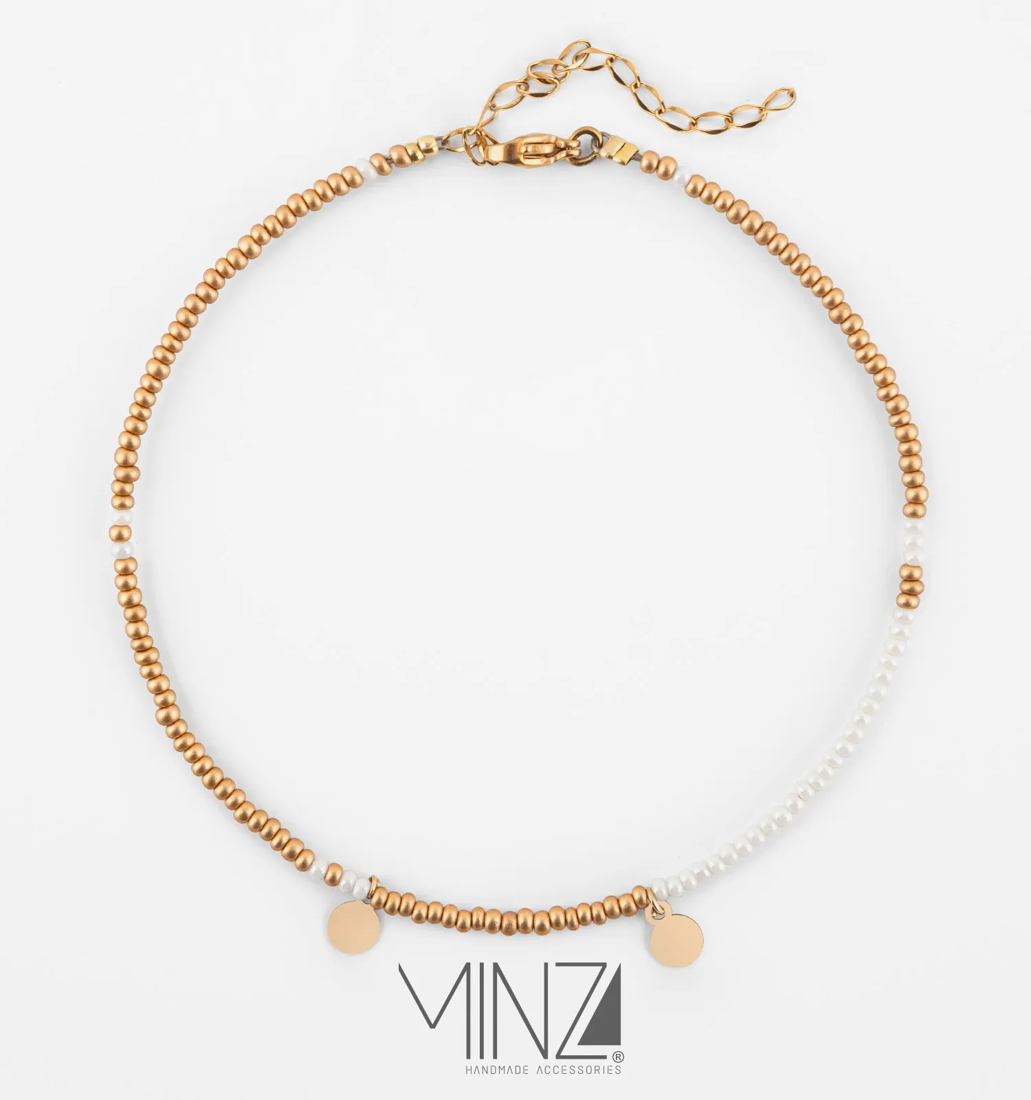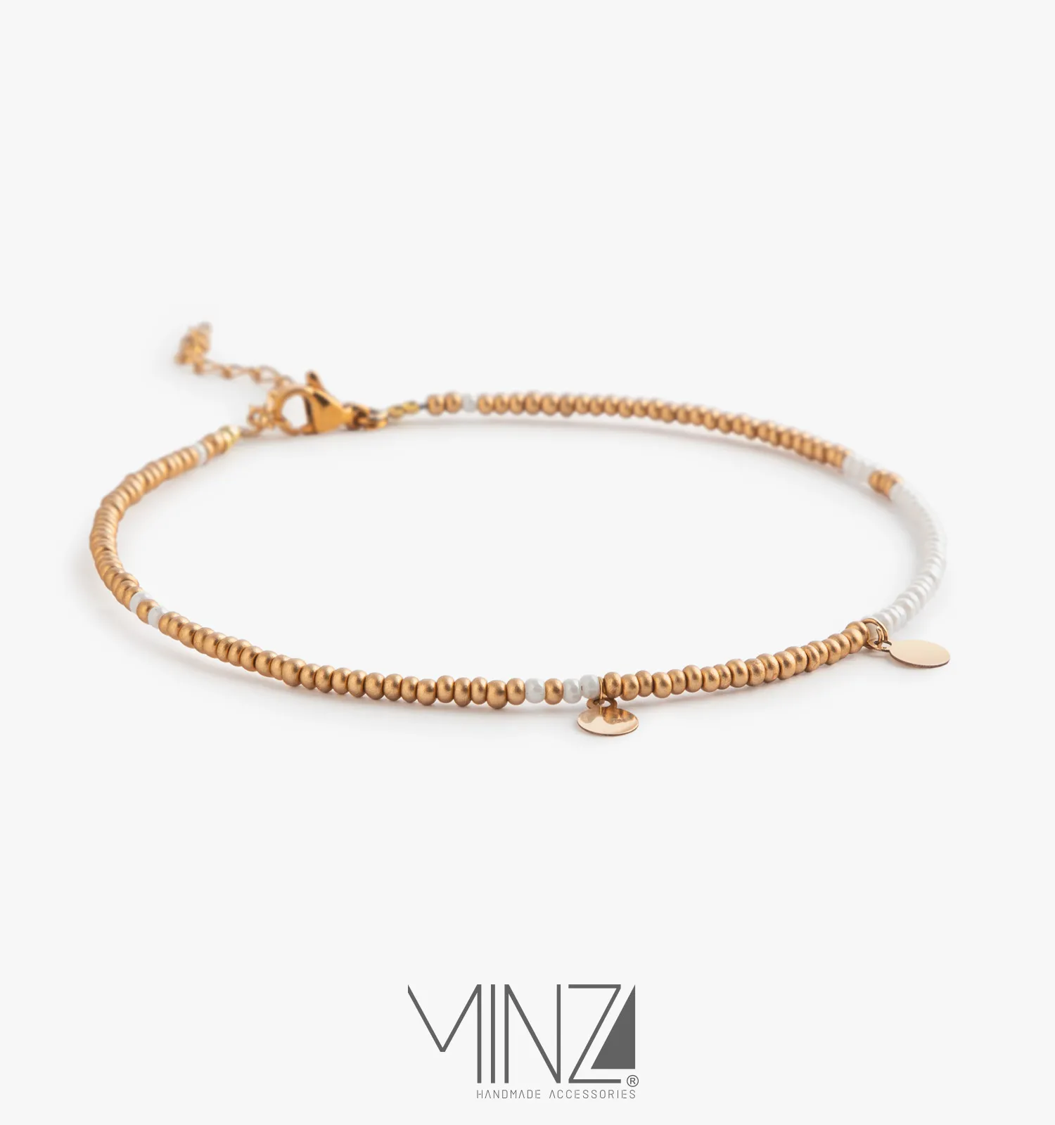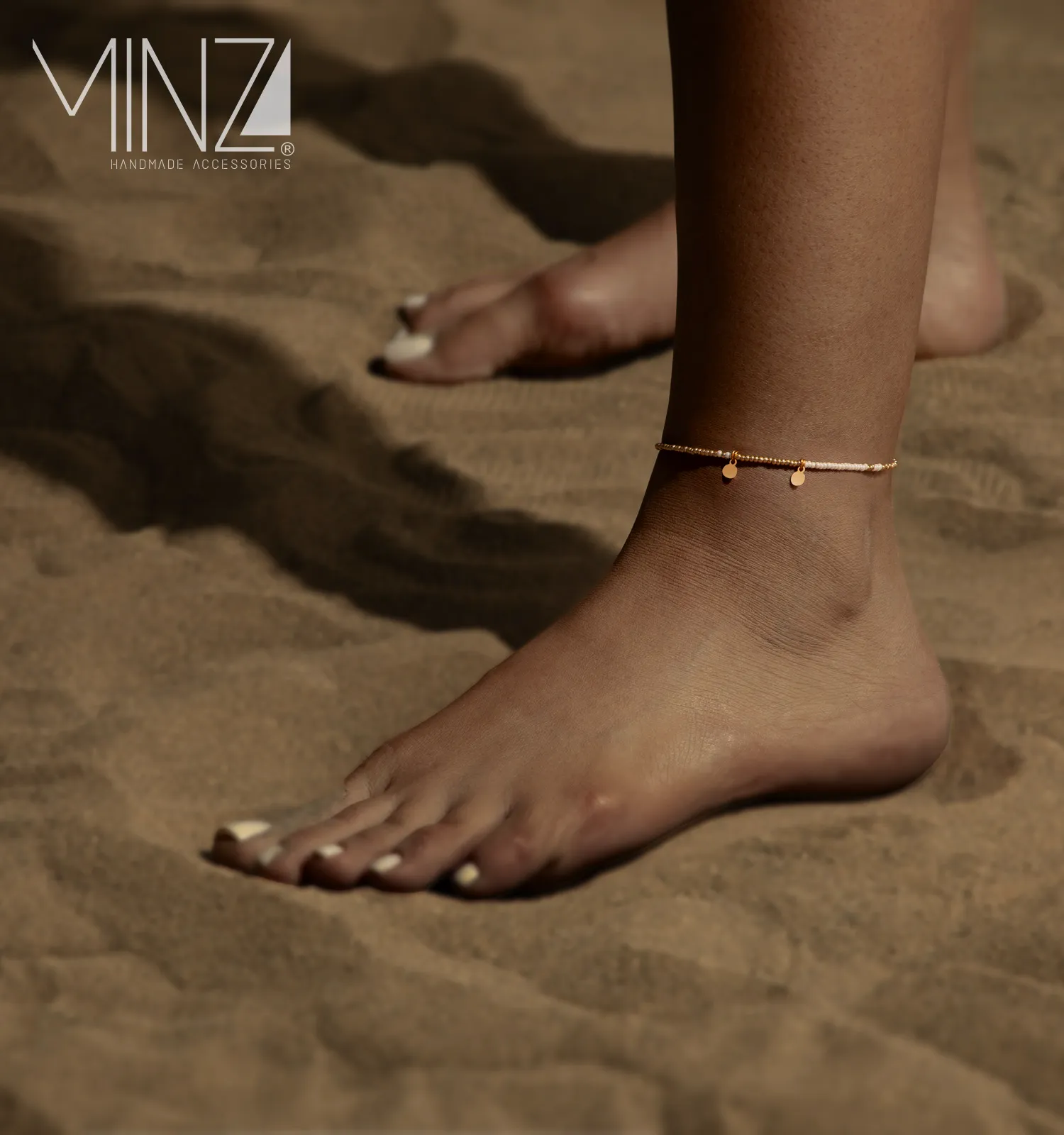 At the center of the design, two small gold coin charms gently sway with every step, catching the light and adding a soft rhythmic movement to the anklet. Coin jewelry has long symbolized prosperity, abundance, and good fortune across cultures, making this piece not only beautiful but deeply meaningful. Paired with fine Czech beads, the composition creates a balanced harmony between minimalism and charm.