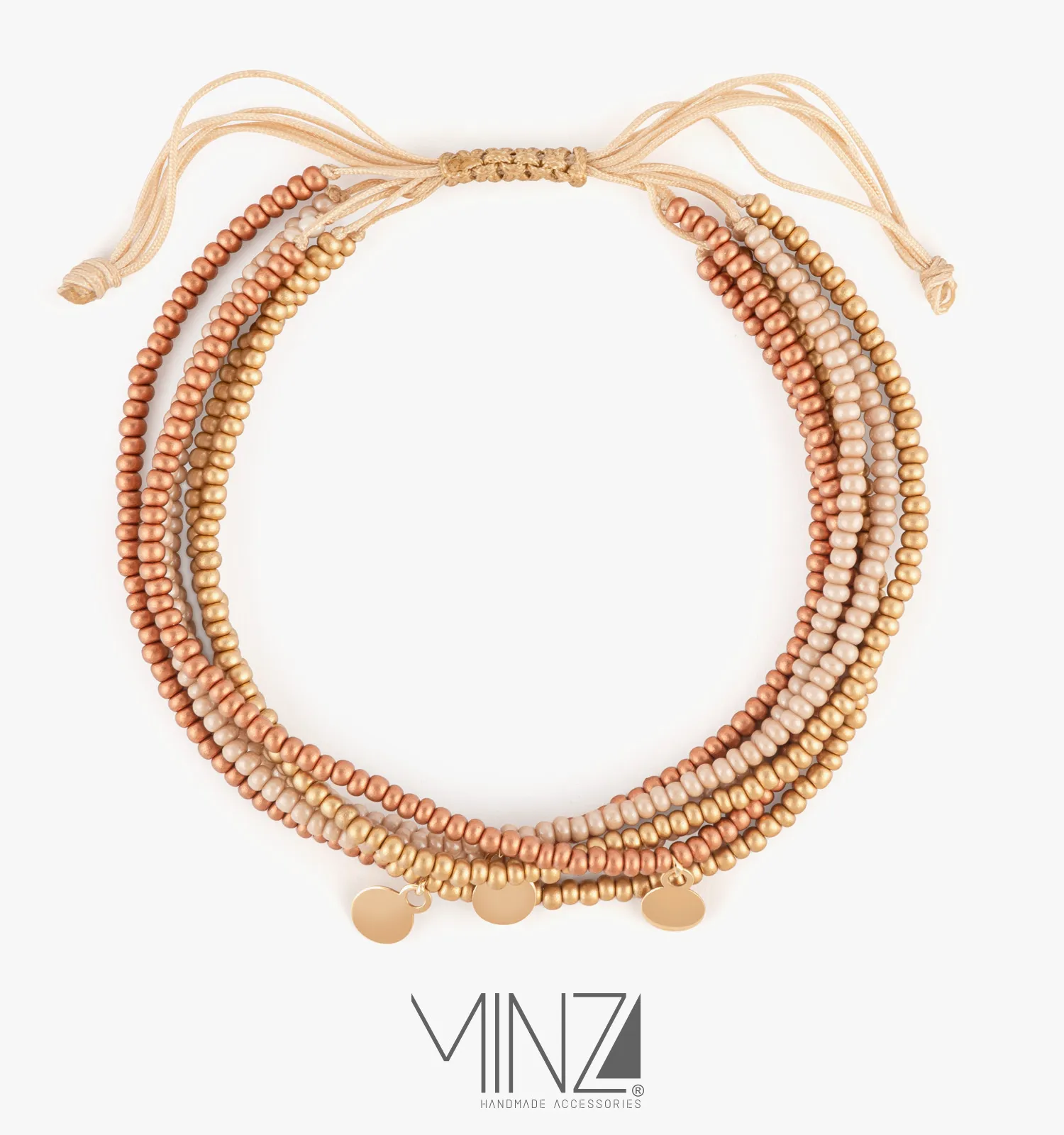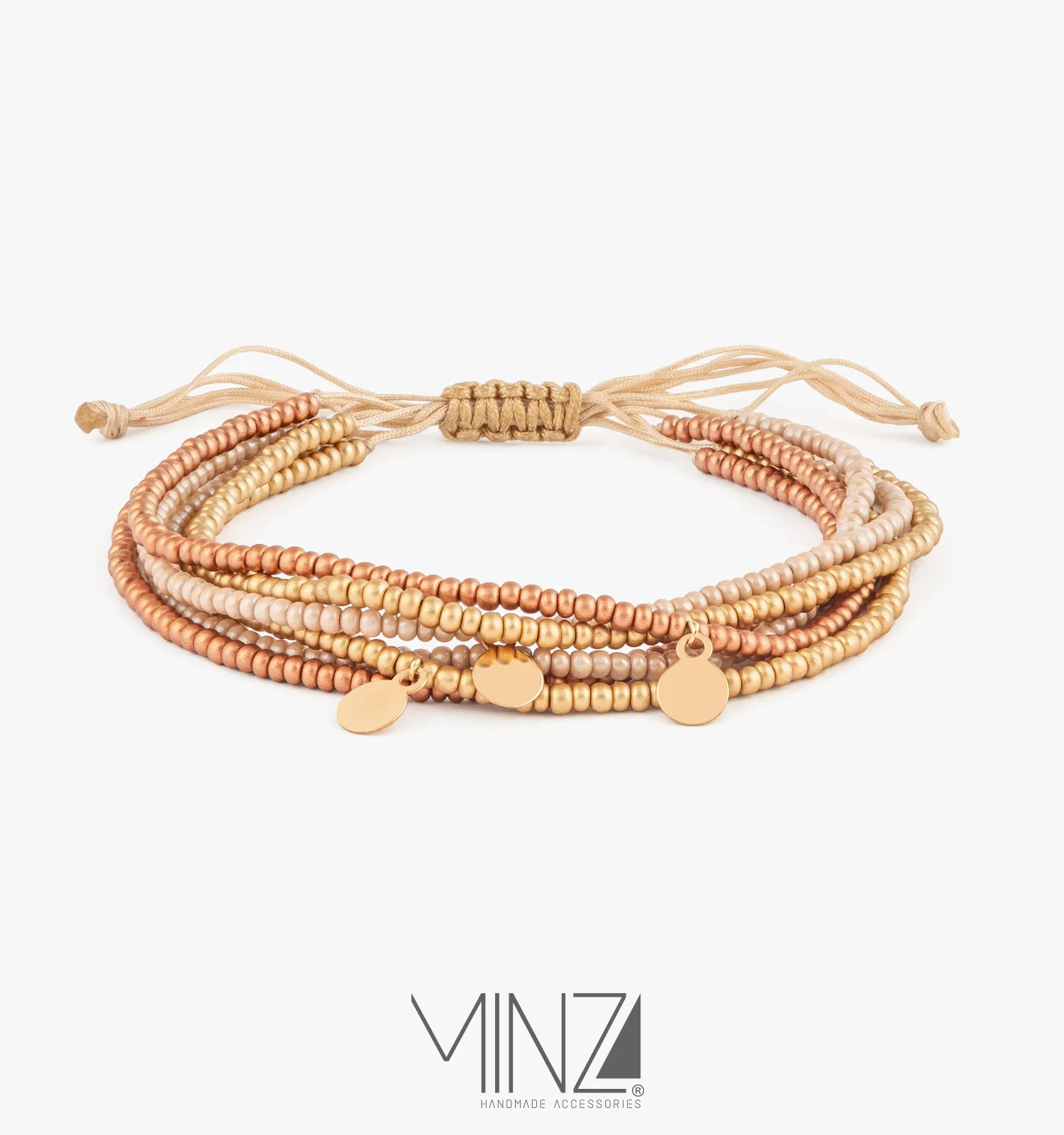 At the center of the bracelet rest three delicate round 18K gold charms, adding subtle movement and refined brilliance to the design. Surrounding them, multiple strands of warm-toned Czech beads create a soft gradient of copper, bronze, and gold — evoking the glow of sunset light and the richness of natural earth tones.