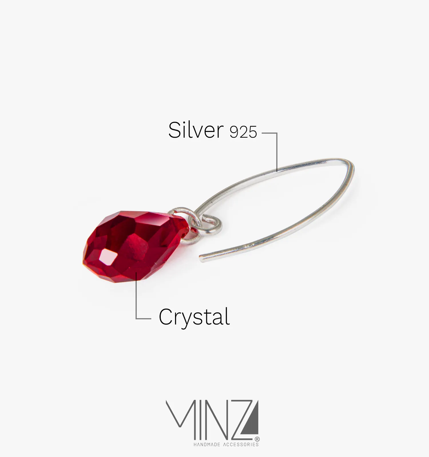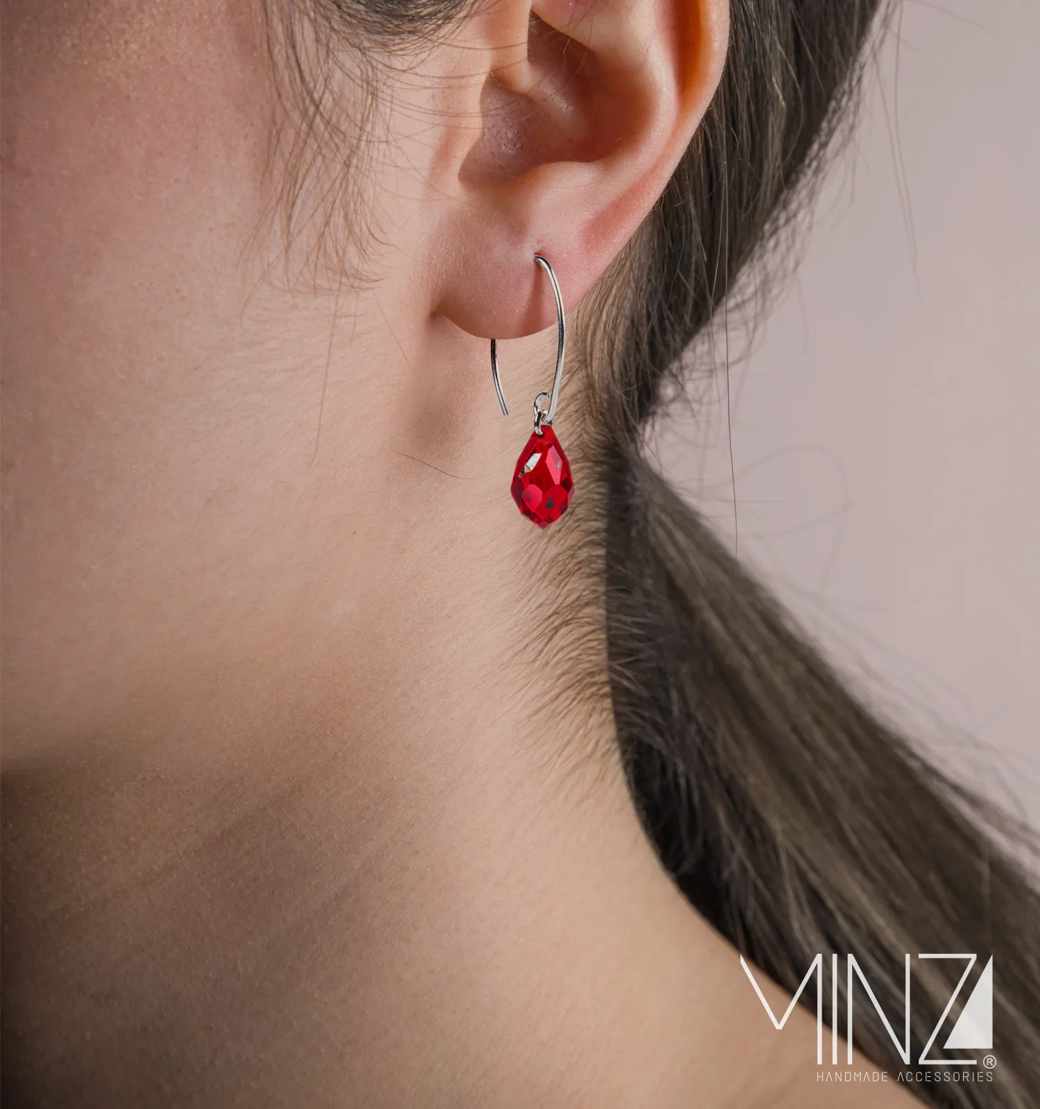 The “Crystal Tears” Silver Earrings feature red teardrop crystals on French hook silver wires, designed for graceful movement and everyday elegance.