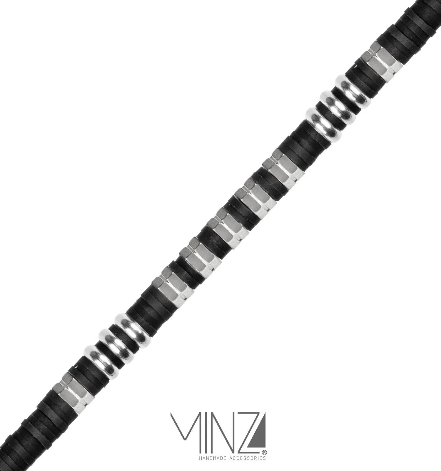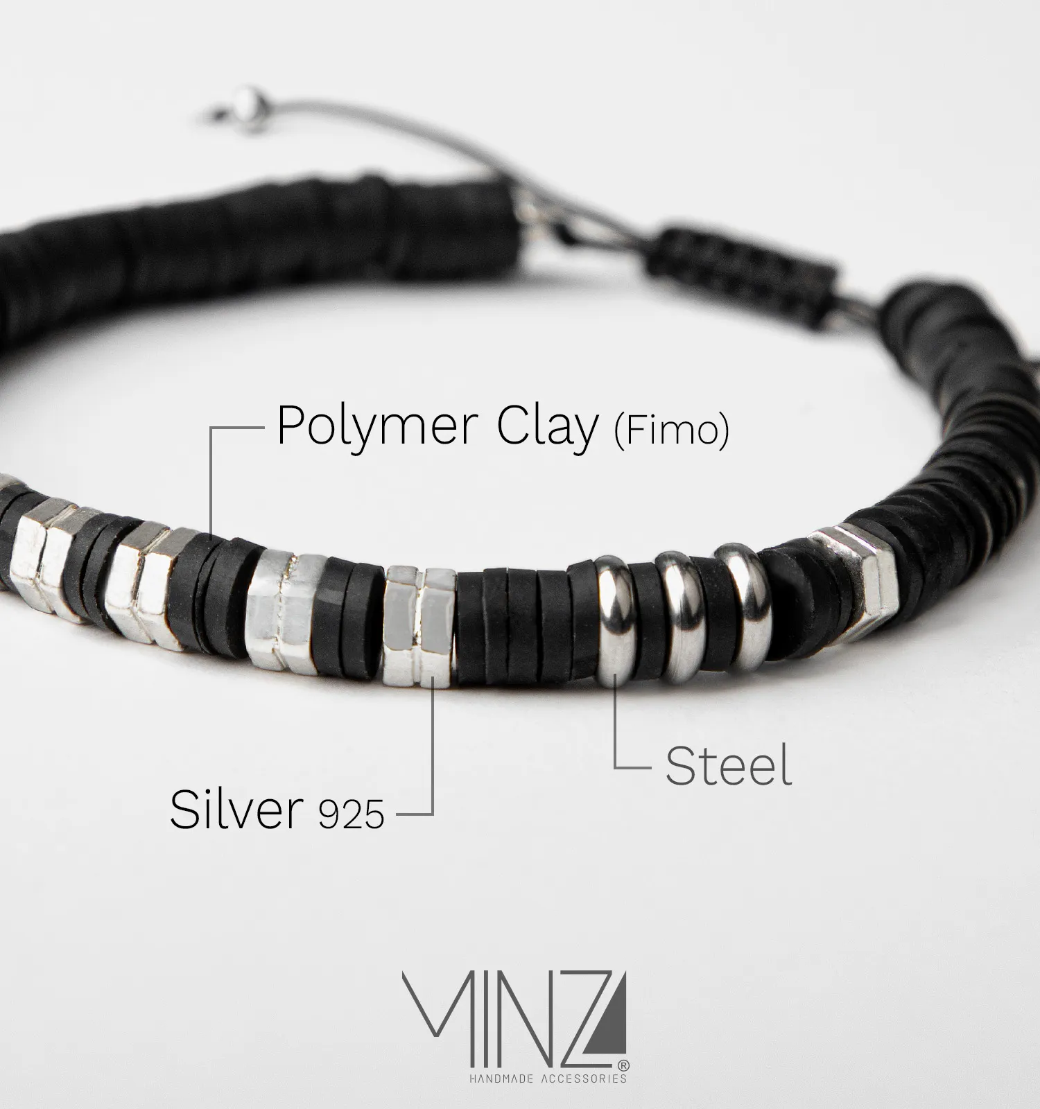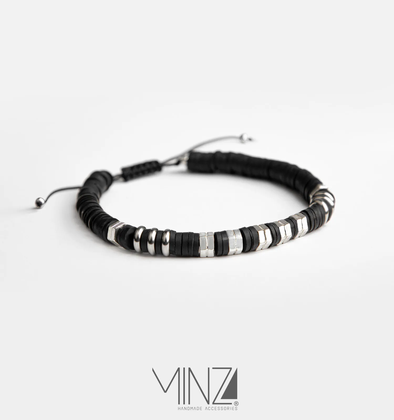 At the center of the design, polished silver beads sit between matte black fimo washers, creating a striking rhythm of light and dark tones. Hematite and steel elements add depth and structure, while all materials are carefully threaded with highly durable hemp cord to ensure resilience and everyday comfort. The adjustable sliding-knot closure allows the bracelet to fit wrists from 16 to 21 cm, making it practical for daily wear.
