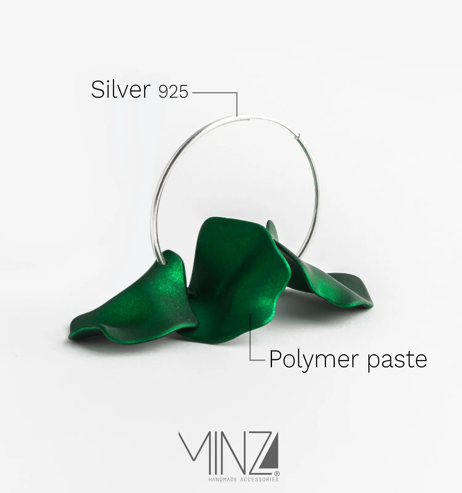 Crafted from sterling silver (925), the earrings feature a circular silhouette measuring 3 cm in length — a timeless shape symbolizing eternity, wholeness, and continuity. Inside each hoop rests a delicate petal-inspired centerpiece made from polymer clay, shaped to resemble soft green leaves gently unfolding in nature.