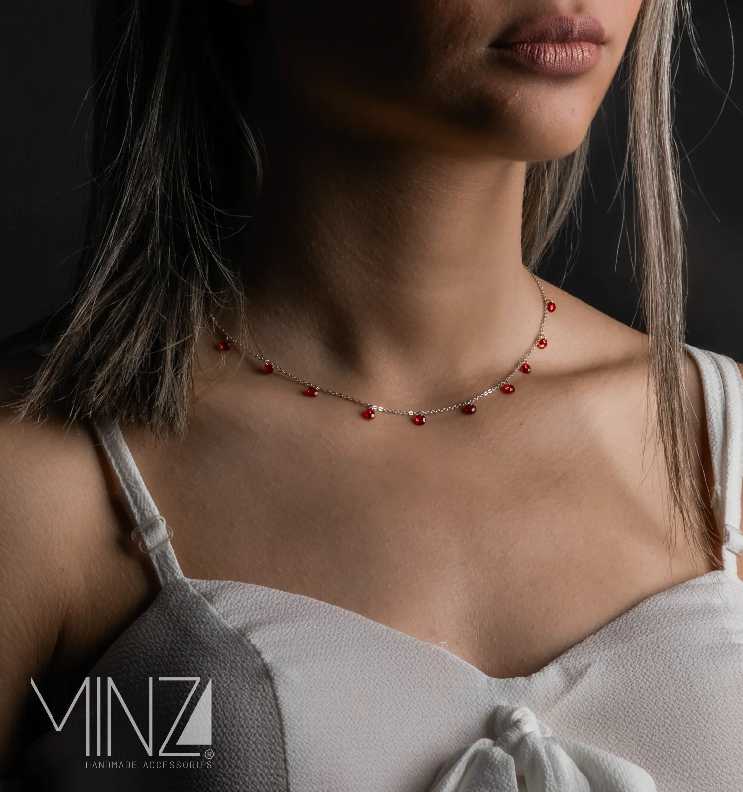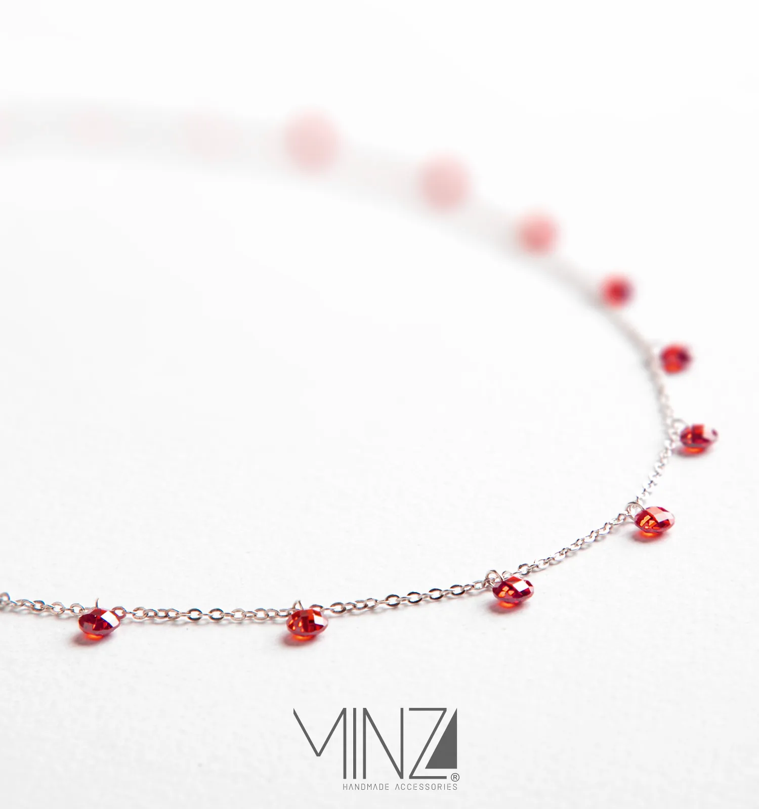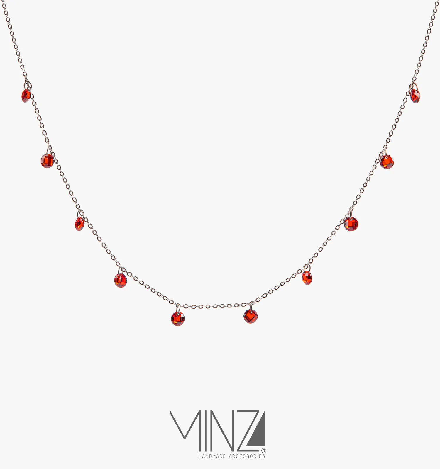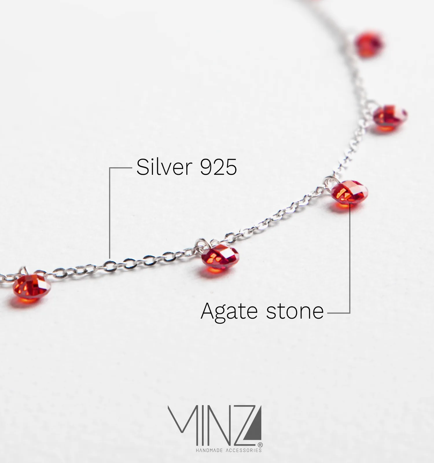 Crafted from sterling silver (925), the necklace features a delicate 43 cm chain adorned with ten red agate stones (4×4 mm each), carefully spaced along the length of the chain. The symmetrical placement of the stones creates a graceful flow of color, allowing the necklace to shimmer softly with every movement.