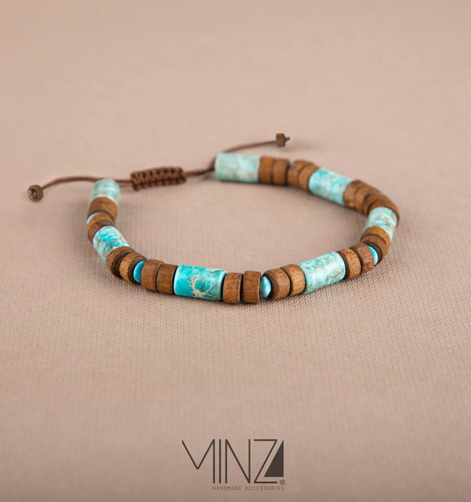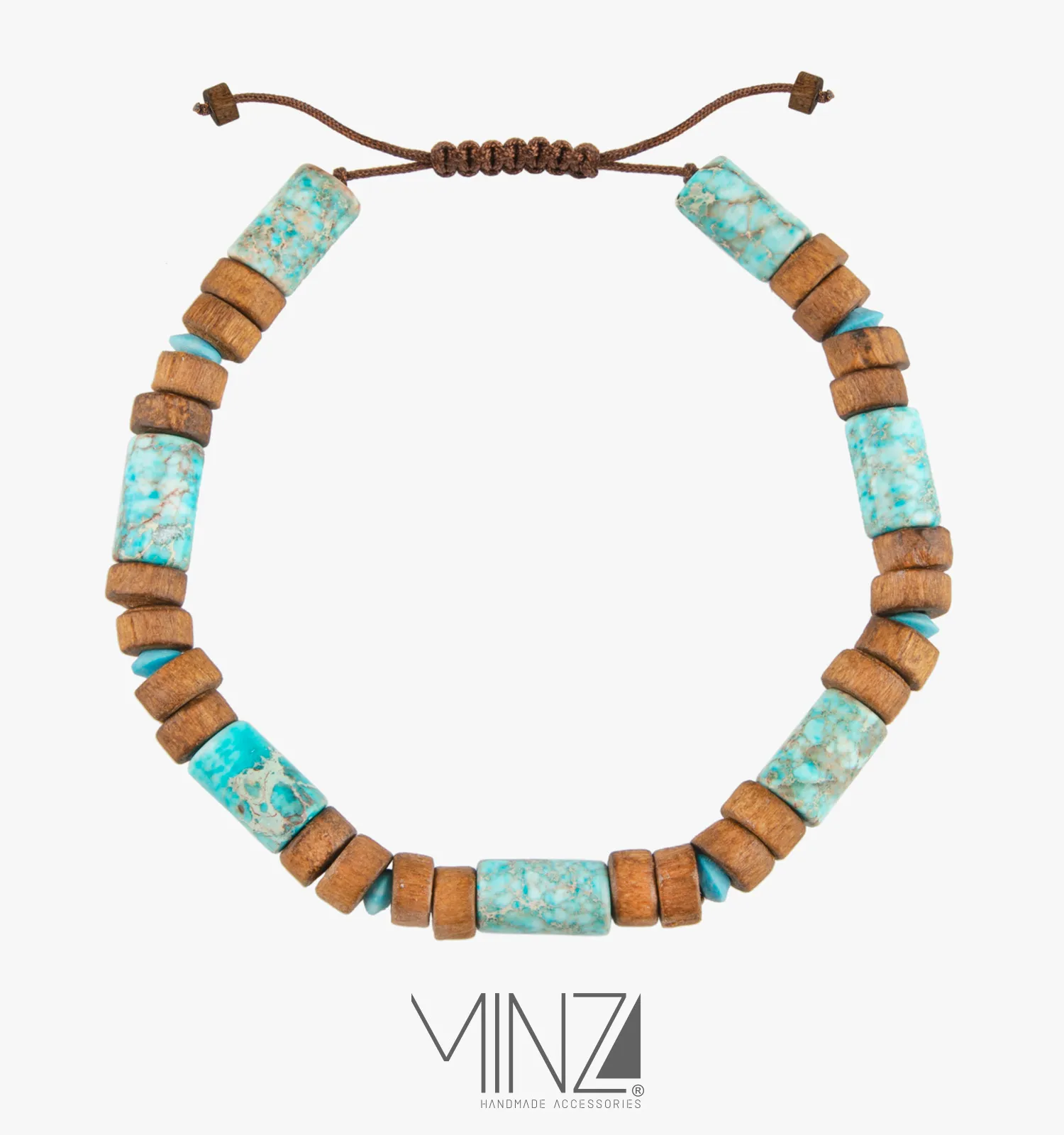 The design places vibrant turquoise and warm jasper stones between wooden beads, forming a balanced rhythm of color and texture. Shades of deep brown, calming blue, and natural earth tones work together to evoke a sense of adventure, freedom, and quiet strength. The sliding knot closure allows the bracelet to adjust comfortably to wrist sizes between 16–21 cm, ensuring a secure and personalized fit for everyday wear.
