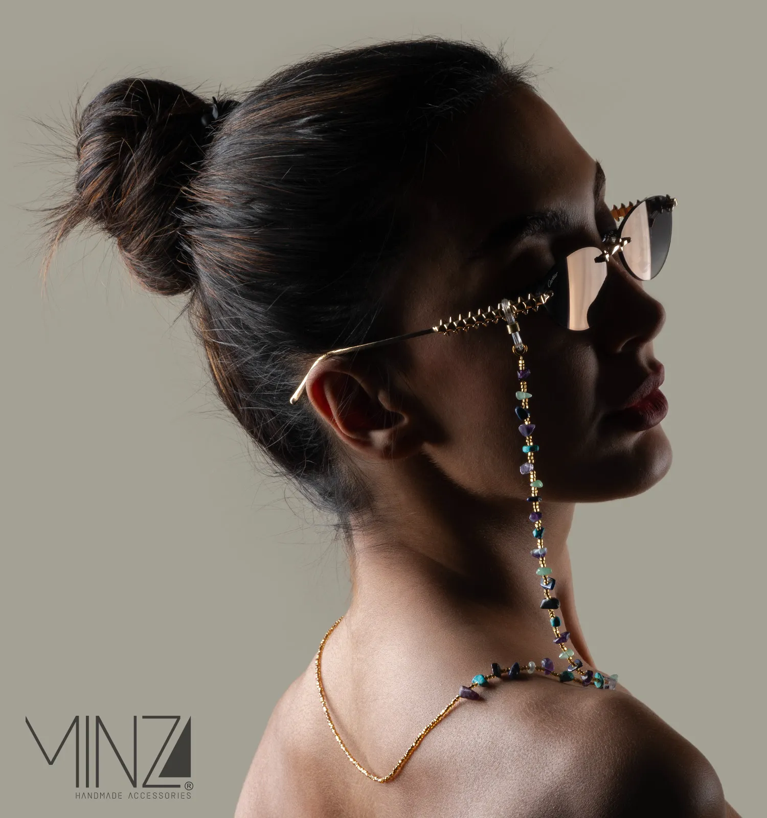 - Avoid contact with water, perfume, and chemicals to protect the natural stones and bead finish. Store the glasses chain in a soft pouch and gently clean with a dry, soft cloth after use.