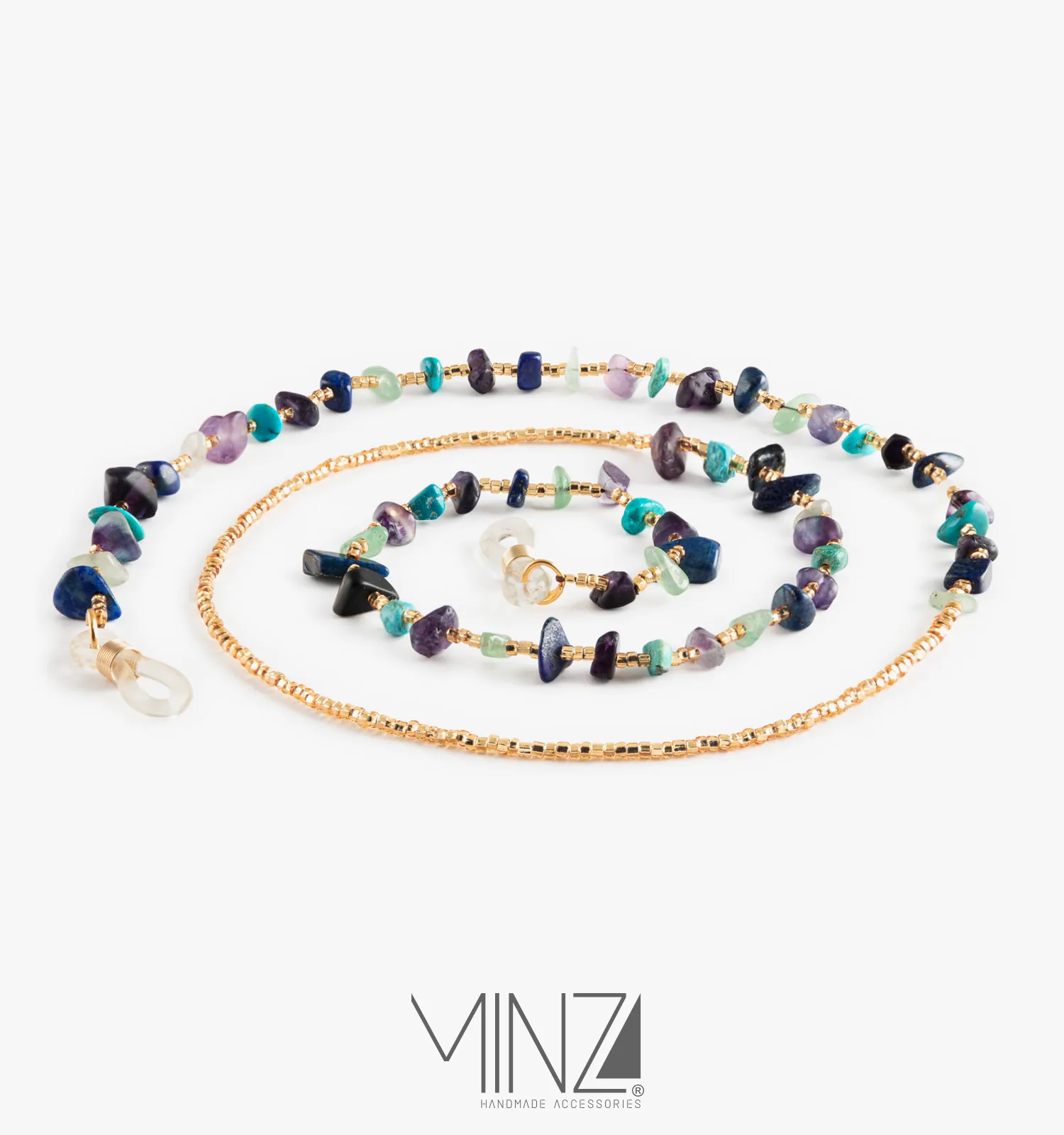 Handcrafted with natural broken stones including amethyst, turquoise, prehnite, and lapis lazuli, this glasses chain is accented with delicate gold-toned Czech beads that create warmth and balance between the stones. Each irregular stone carries its own texture and character, making every piece subtly unique.