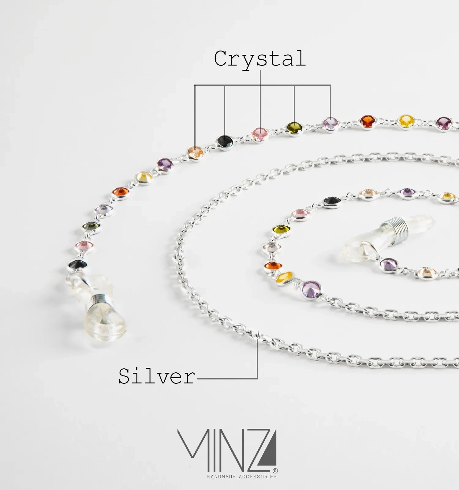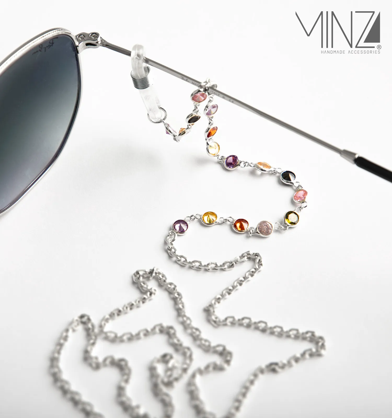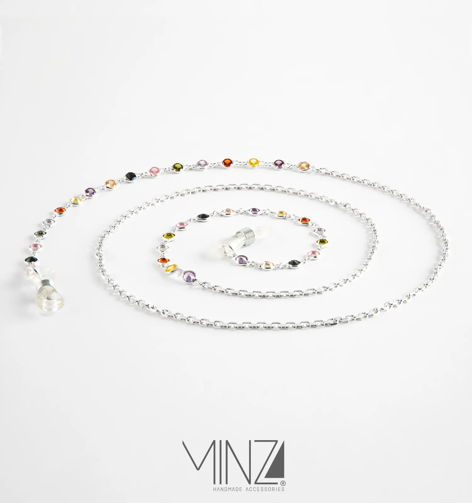 Handcrafted from sterling silver and adorned with delicately set multicolored crystals, Iris transforms eyewear into a radiant accessory. Each crystal reflects a different hue, echoing the spectrum of the rainbow and creating a playful yet sophisticated rhythm along the silver chain. The polished silver base adds balance and luminosity, allowing the colors to shine without overpowering the design.