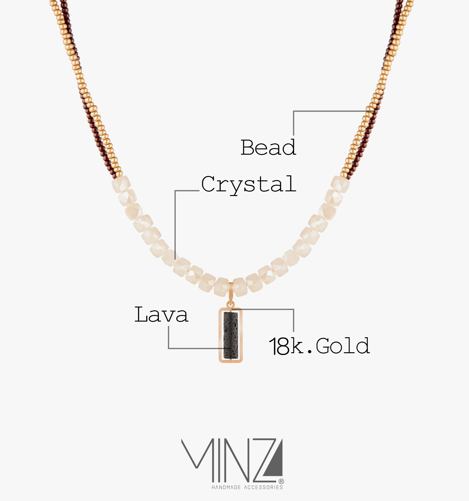 Hand-strung with two rows of golden and brown Czech seed beads, the necklace draws inspiration from the power of nature — from glowing magma beneath the surface to the gentle shimmer of light on stone. At the center rests a cylindrical 18K gold pendant inlaid with natural lava, embodying a unique fusion of resilience and grace.