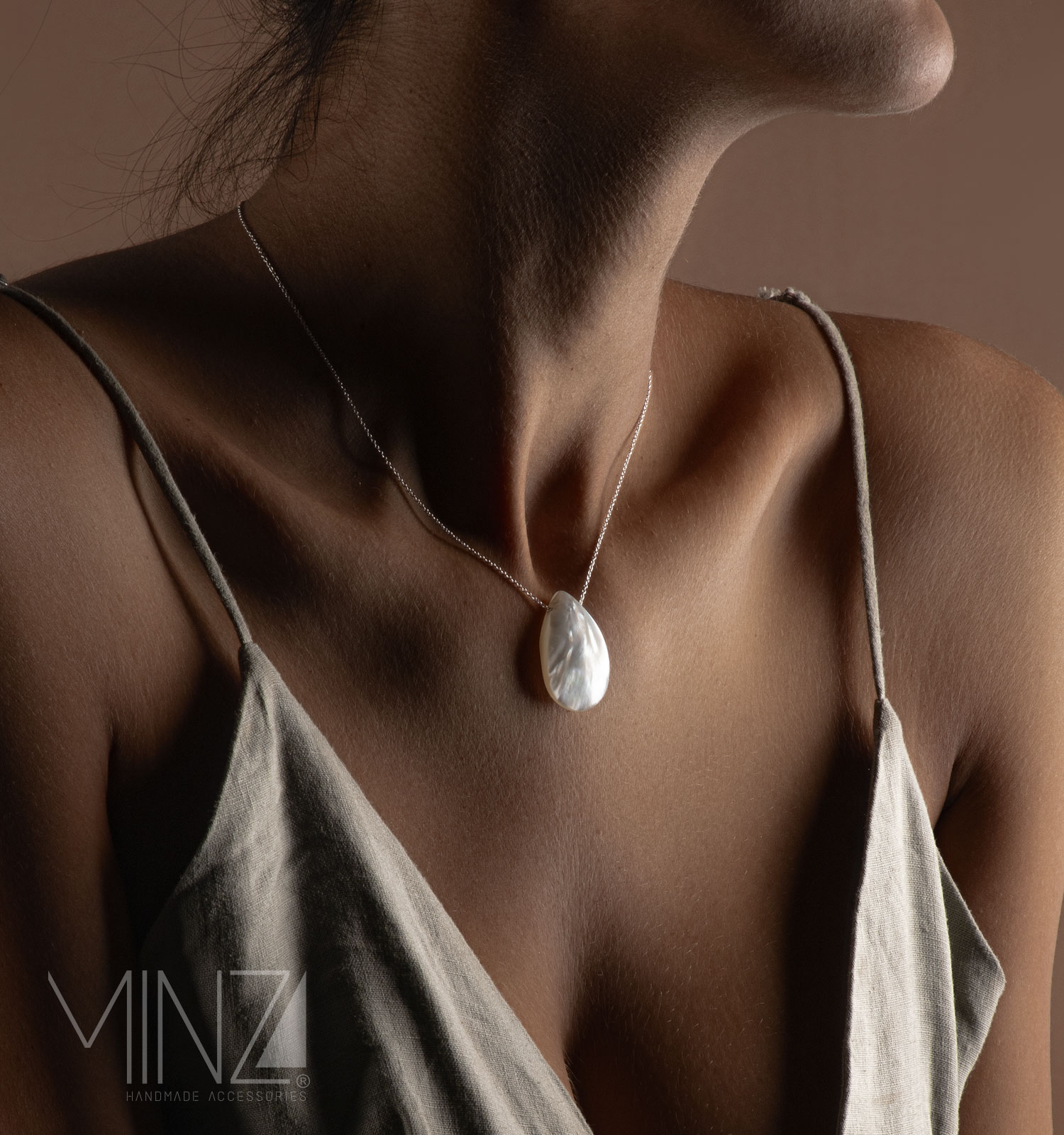 At the heart of the ” Oyster ” Silver Necklace lies a tear-shaped shell stone pendant, measuring 2.5 by 1.8 cm. This exquisite gemstone, reminiscent of a delicate oyster shell, exudes natural beauty and grace. Its unique dimensions and intricate texture make it a statement piece that effortlessly captures the imagination.