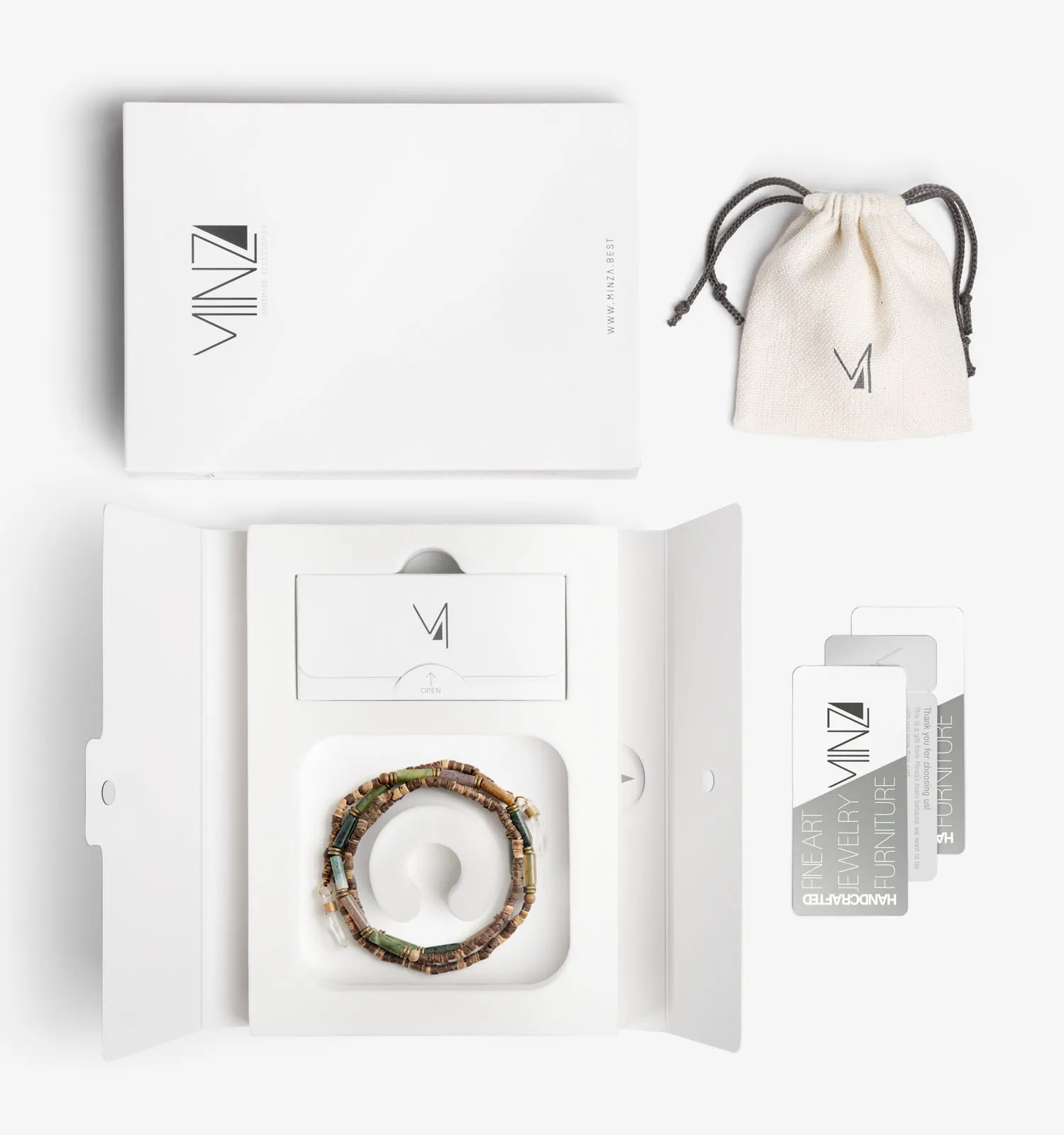 - Store in a fabric pouch to preserve the natural stones, wood textures, and metal accents.