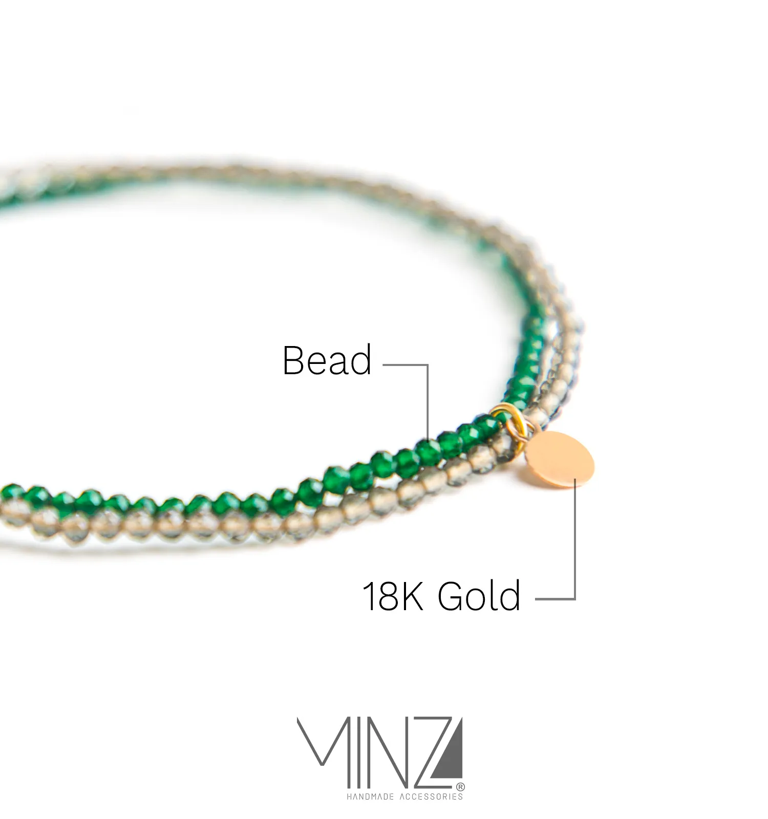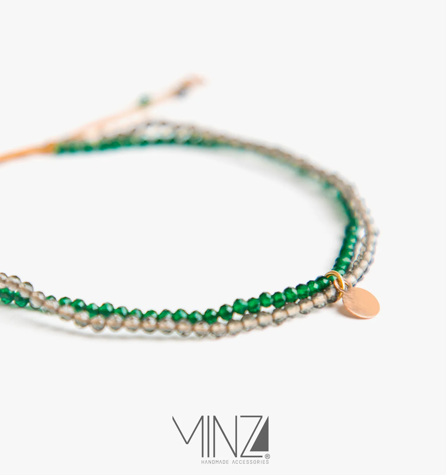 This design is formed from two delicate bracelets united through a central circular gold pendant — a timeless symbol of wholeness, harmony, and eternity. Rows of tiny jade and silica stones surround the centerpiece, creating a soft green glow that feels fresh, calm, and effortlessly sophisticated. Handwoven on durable hemp cord and finished with a sliding-knot closure, the bracelet offers an adjustable fit (14–18 cm) for everyday comfort and versatility.