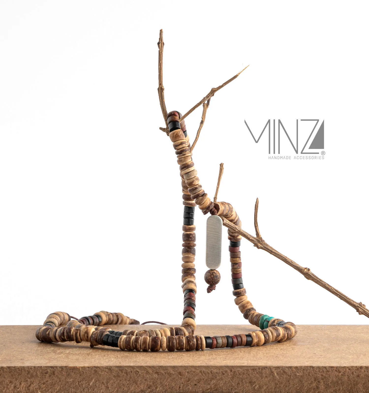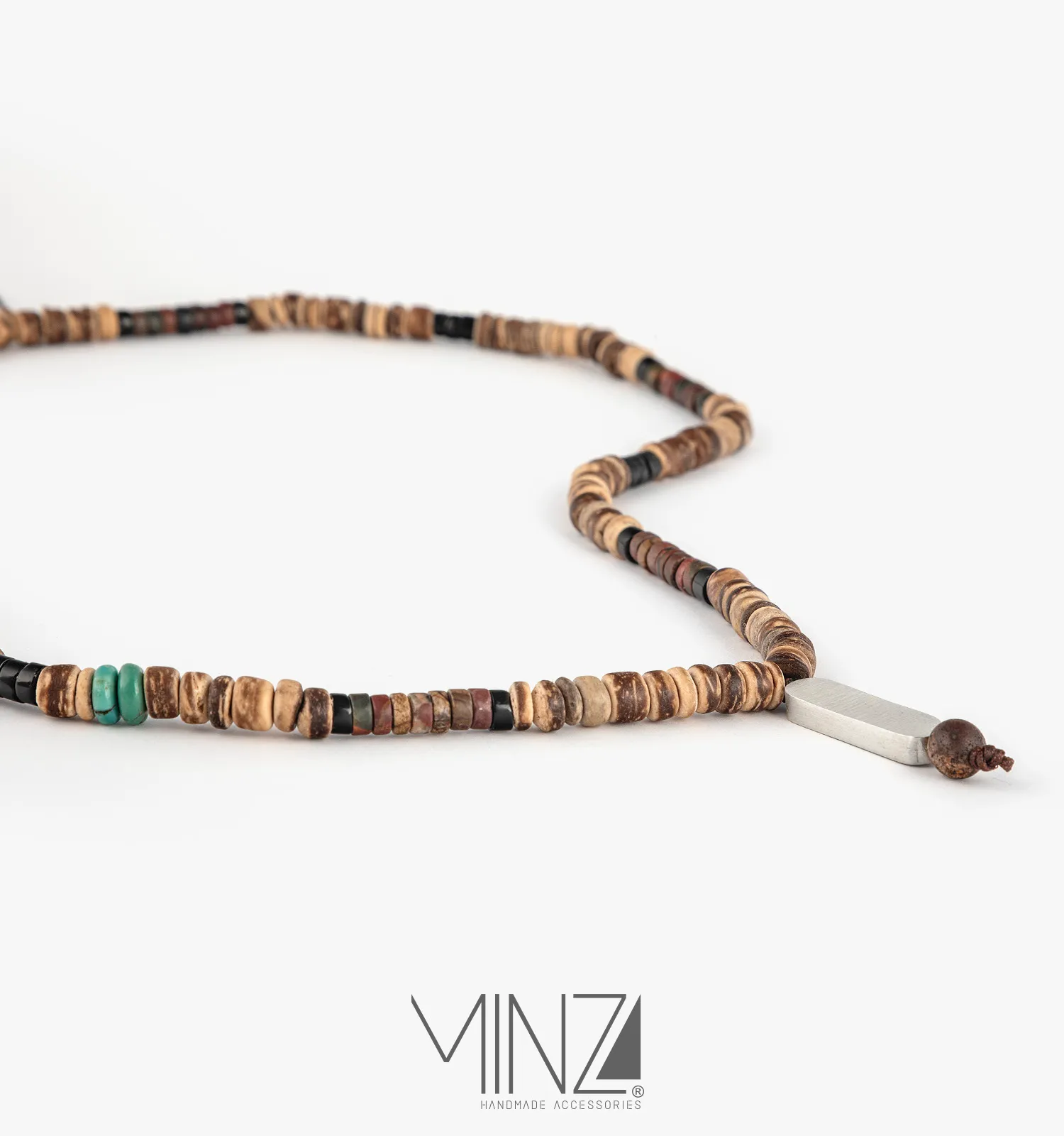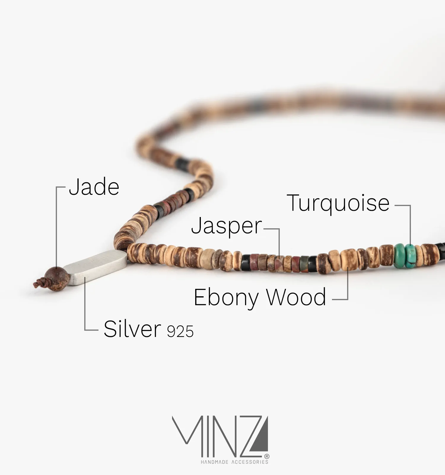 Silver is believed to cleanse negative energy and promote emotional balance, while onyx symbolizes protection and focus. Turquoise represents vitality and optimism, jade encourages harmony and prosperity, and jasper is known for grounding strength. Combined with the endurance of ebony wood, the Maurice necklace becomes more than jewelry — it becomes a symbol of balance, strength, and connection to nature.