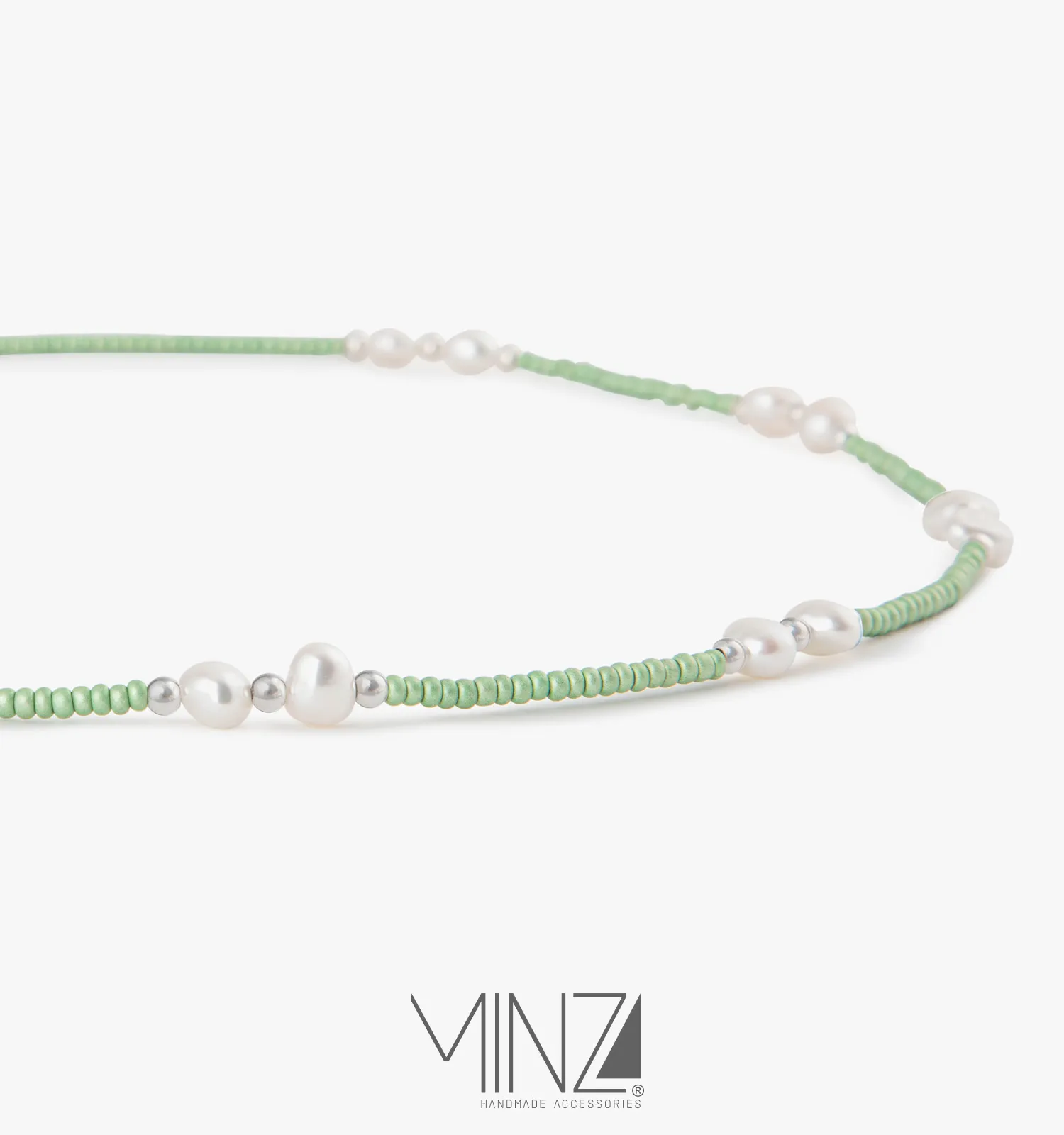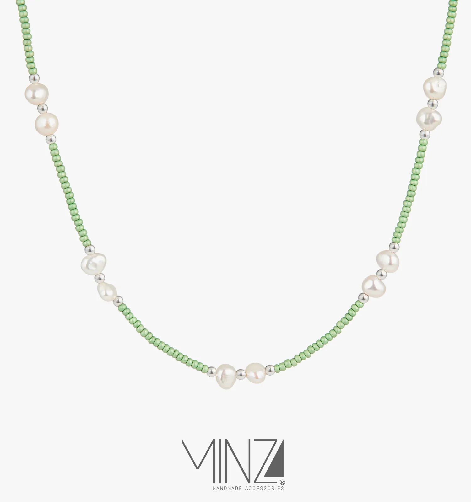 The entire chain is formed from delicate green Czech beads, creating a soft, luminous strand that feels both fresh and distinctive. Along the necklace, cultured pearls appear at carefully measured intervals, framed by polished silver beads that add brightness and rhythm to the design. This balanced composition creates a beautiful harmony of texture, color, and light.
