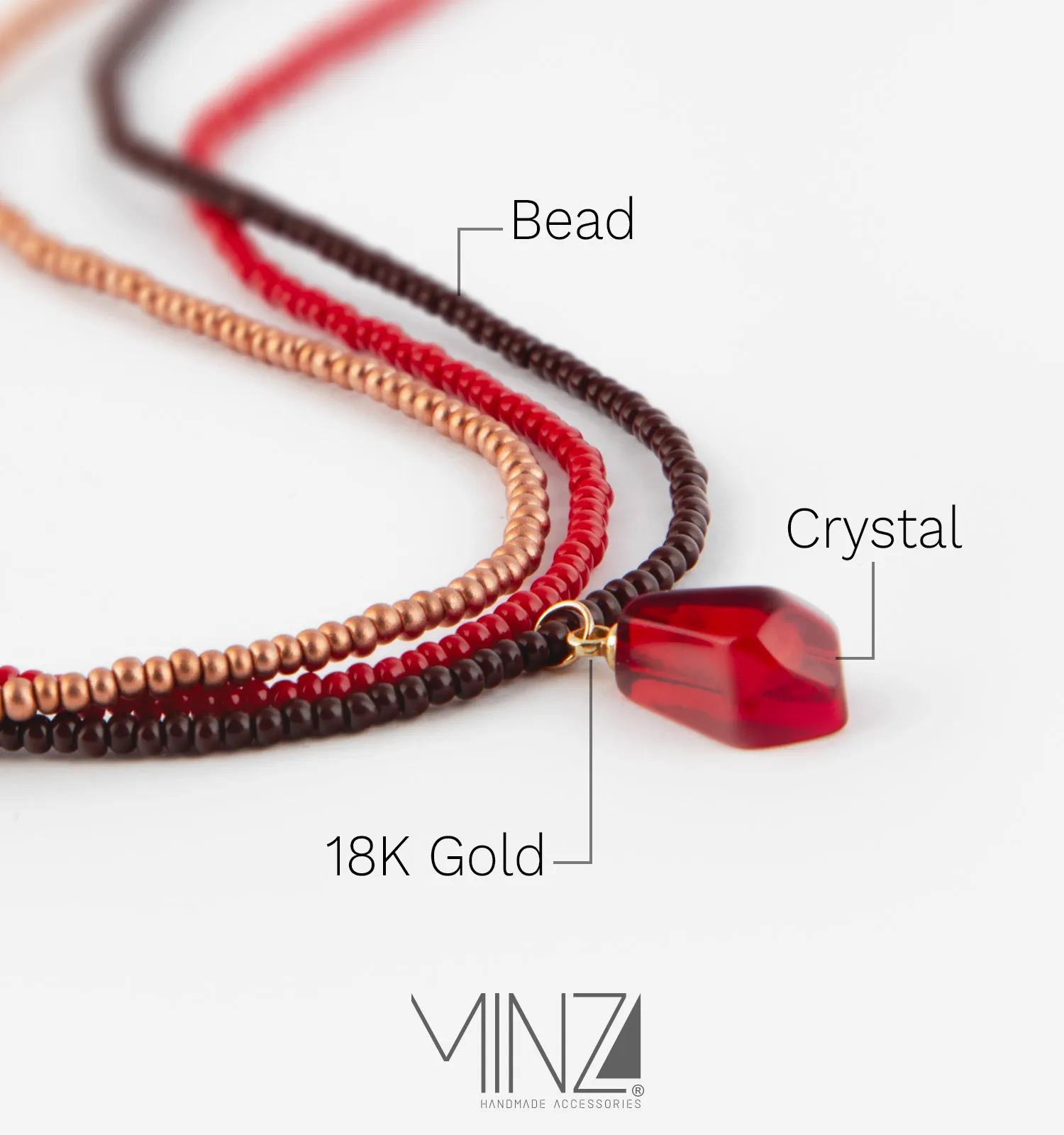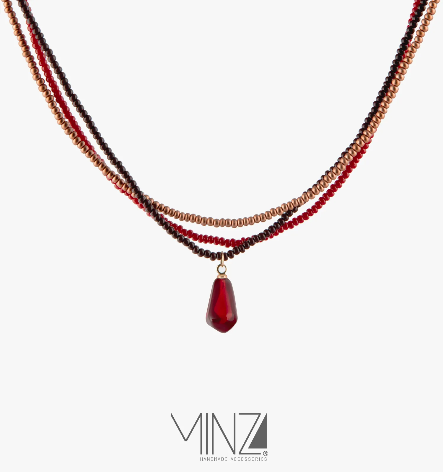 At the heart of the design lies a delicate gold pomegranate-seed pendant, a timeless symbol of abundance, vitality, and feminine energy. Surrounding this centerpiece are three strands of rich red seed beads, carefully arranged to create depth, movement, and warmth. The layered composition adds fullness and visual richness while remaining lightweight and comfortable to wear.