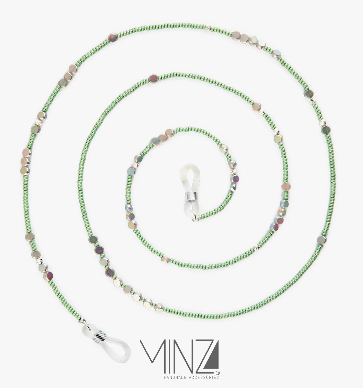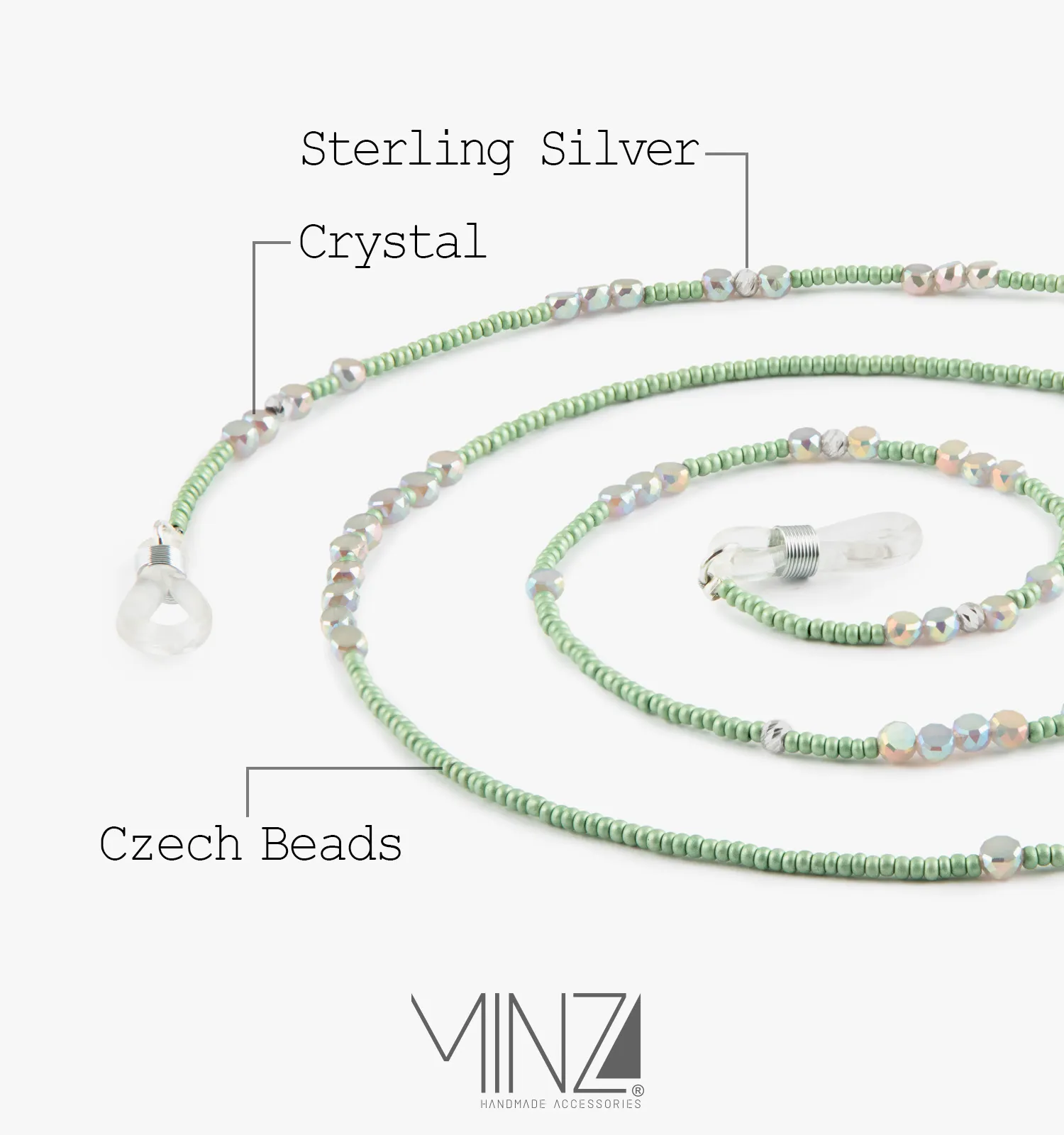“Mint” is a feminine Eyewear chain handcrafted with green Czech beads, crystal accents, and 925 sterling silver, inspired by freshness, calmness, and modern elegance.