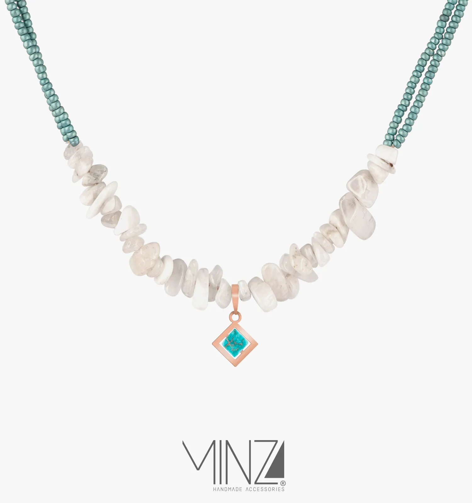 Two rows of soft blue Czech beads form the base of the necklace, creating a gentle ocean-like rhythm that frames the center arrangement of organic moonstone chips. Their natural shapes add movement and texture, giving the necklace a light, airy presence. Suspended at the center is a minimalist 18K gold square pendant holding a turquoise jasper stone — a geometric detail that adds modern contrast to the organic flow of the design.