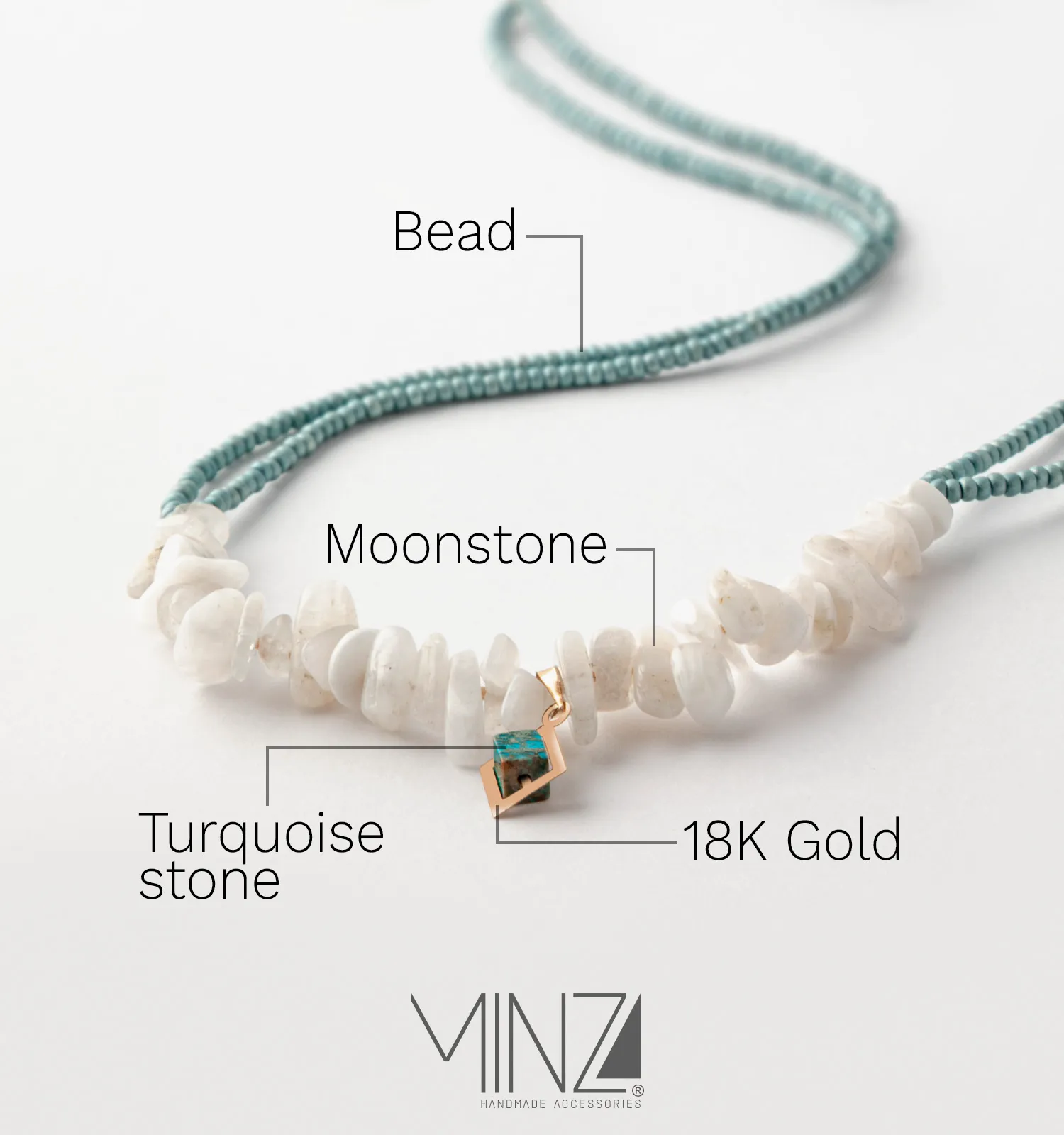 A calm glow inspired by moonlight and sea tones. The “Moonstone” Gold Necklace blends moonstone chips, turquoise jasper, Czech beads, and an 18K gold pendant in a soft, adjustable design for everyday elegance.