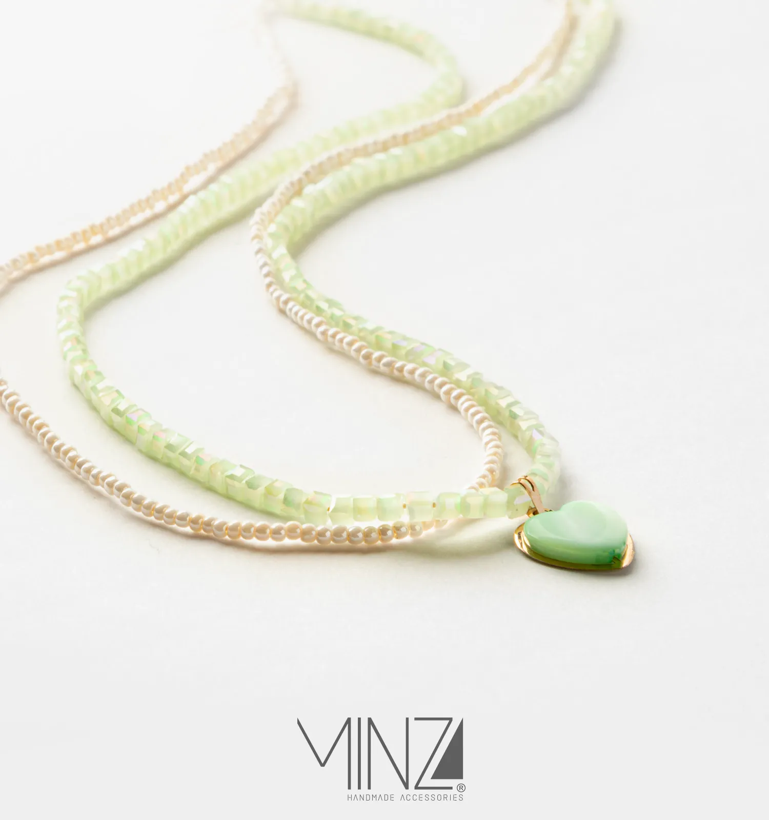 Soft color, romantic symbolism, and radiant elegance meet in the “Pastella” Gold Necklace — a joyful piece designed for women who love delicate details and feminine charm. Handcrafted with 18K gold, Czech seed beads, crystals, and a green shell pendant, this necklace blends playful color with timeless luxury.