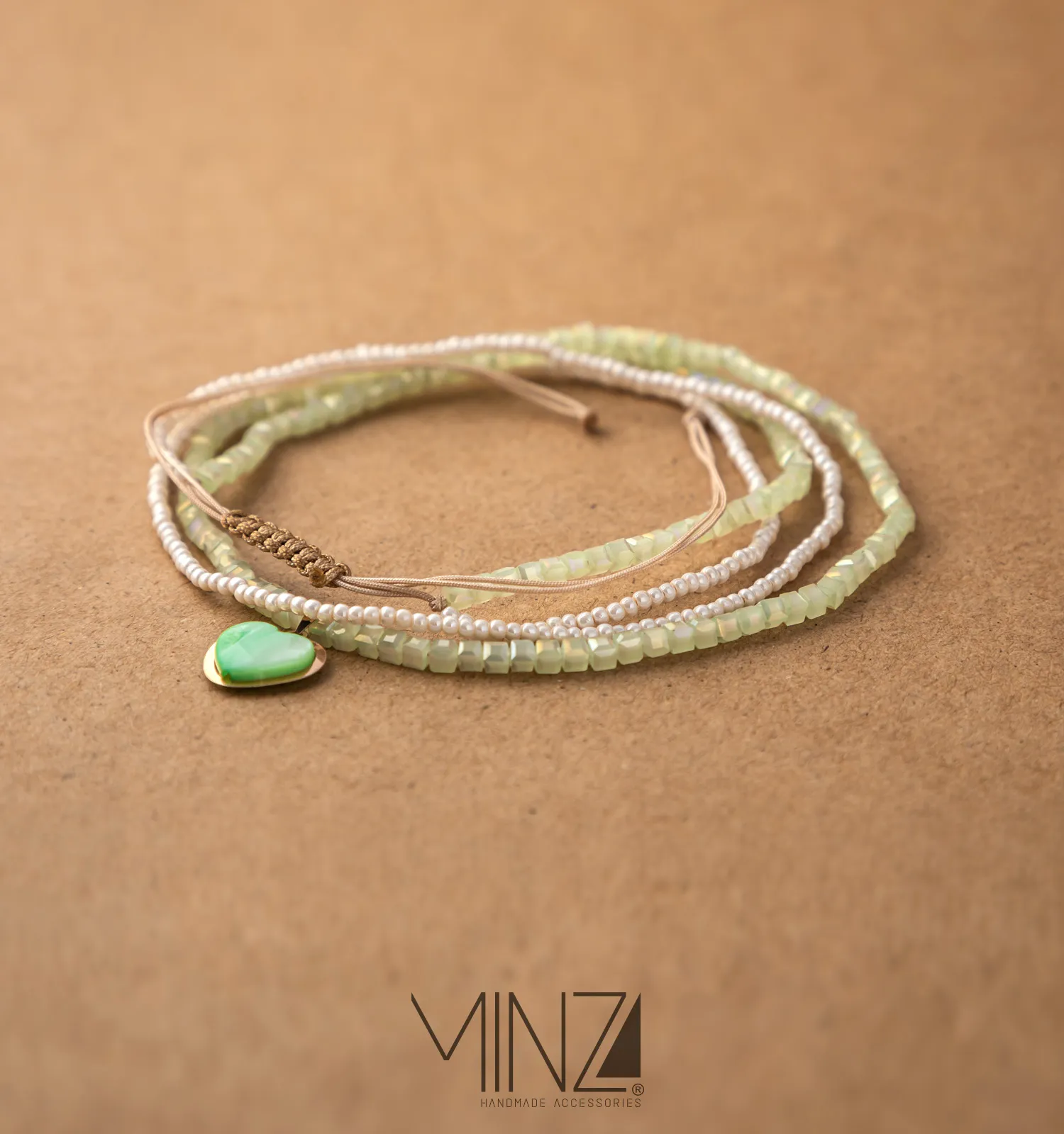 At the center of the design lies a gold heart pendant — a universal symbol of love, warmth, and emotional connection. Suspended from the heart is a soft green shell, adding a natural glow and organic beauty that contrasts beautifully with the sparkle of crystals and the colorful rhythm of the beaded strands.