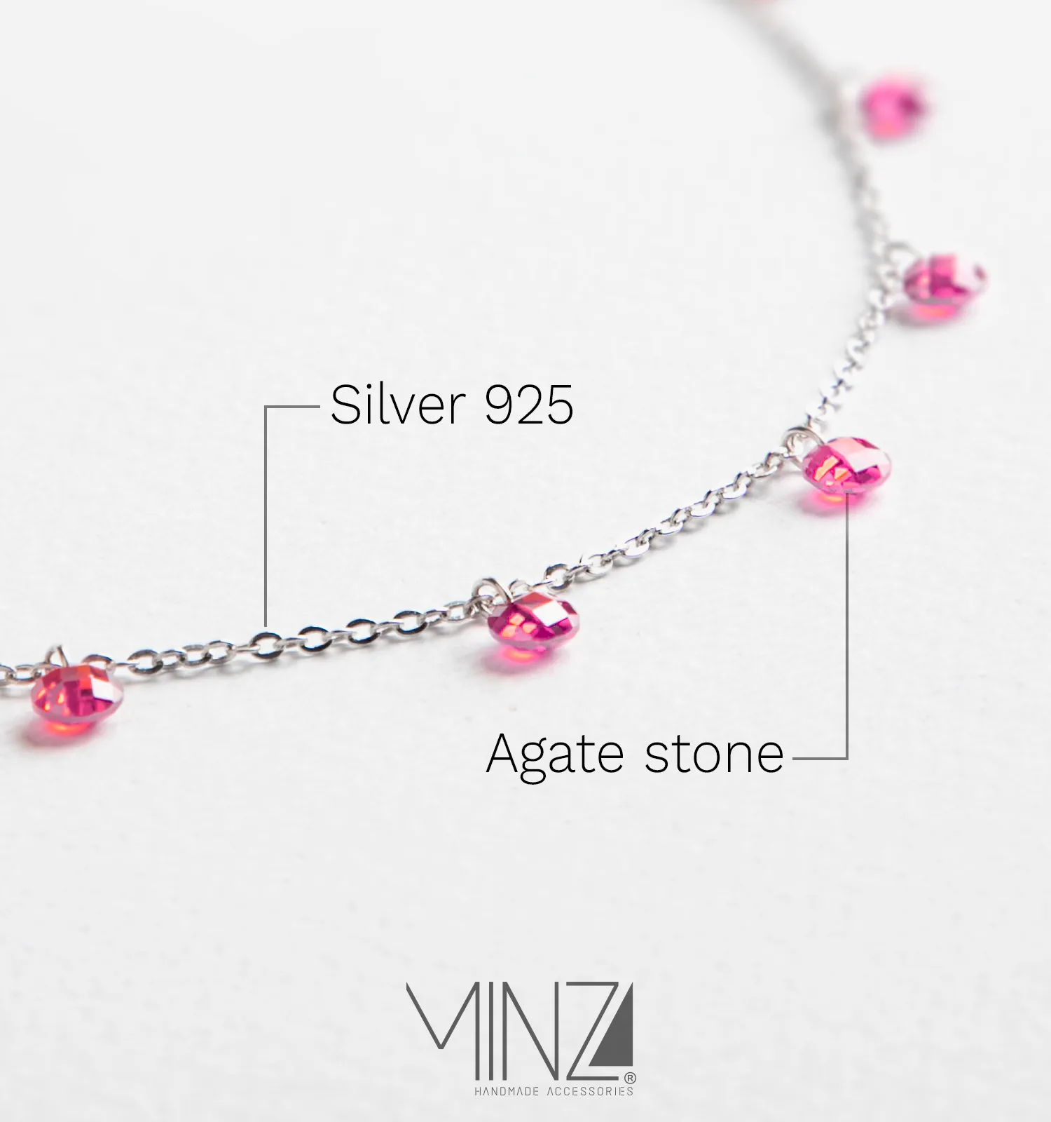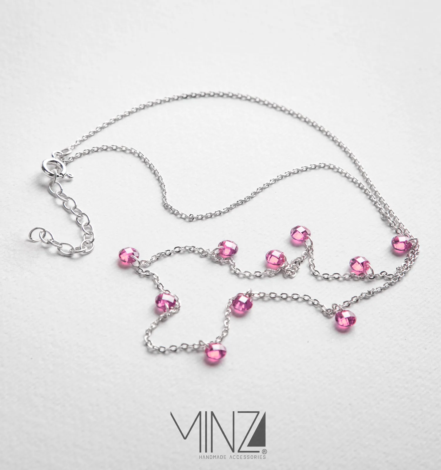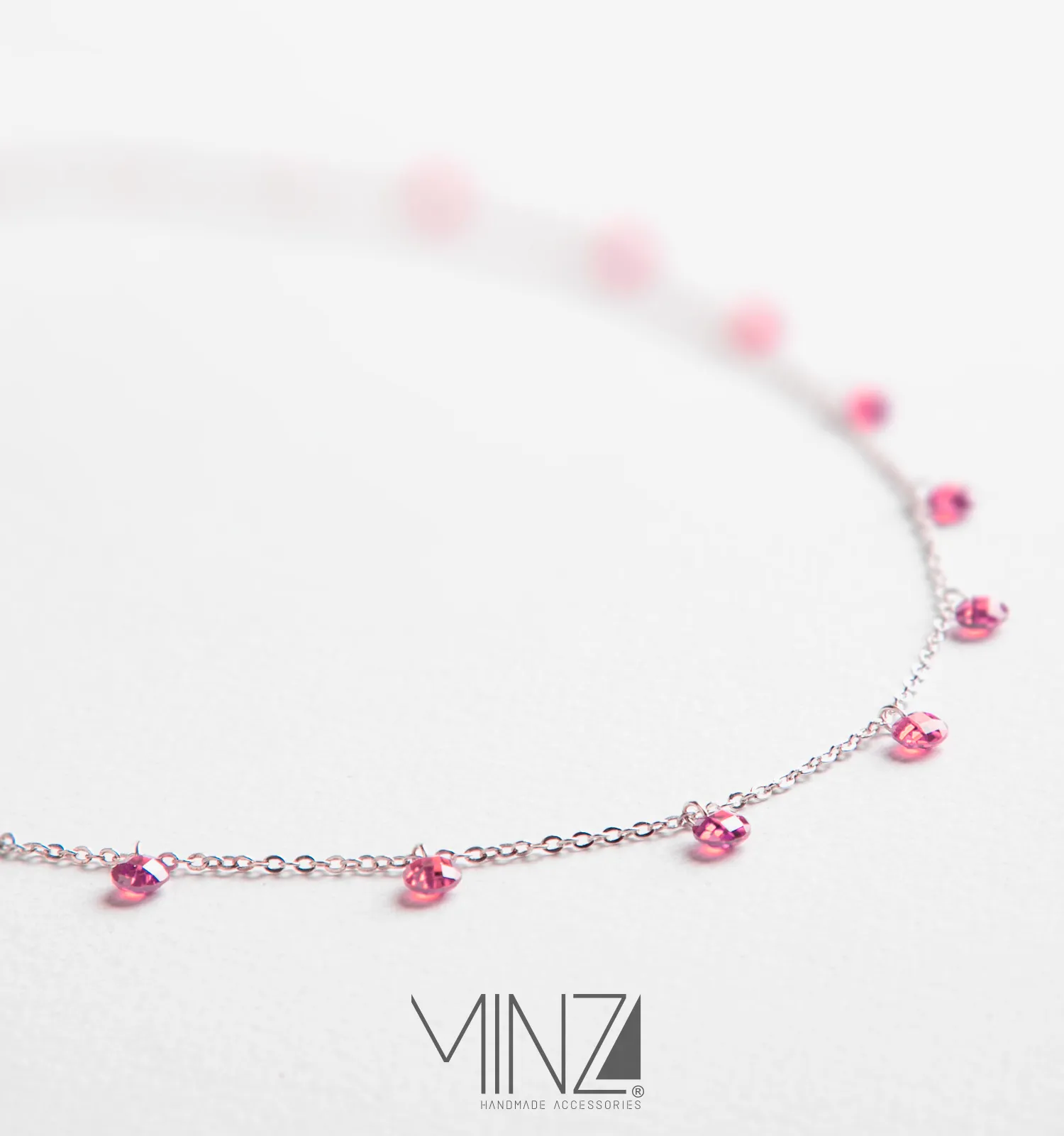 Crafted from 925 sterling silver and adorned with ten perfectly spaced pink quartz stones, this necklace reflects a graceful balance between simplicity and charm. Each stone is carefully positioned along a fine silver chain, creating a subtle rhythm of soft blush sparkle that moves beautifully with every step.