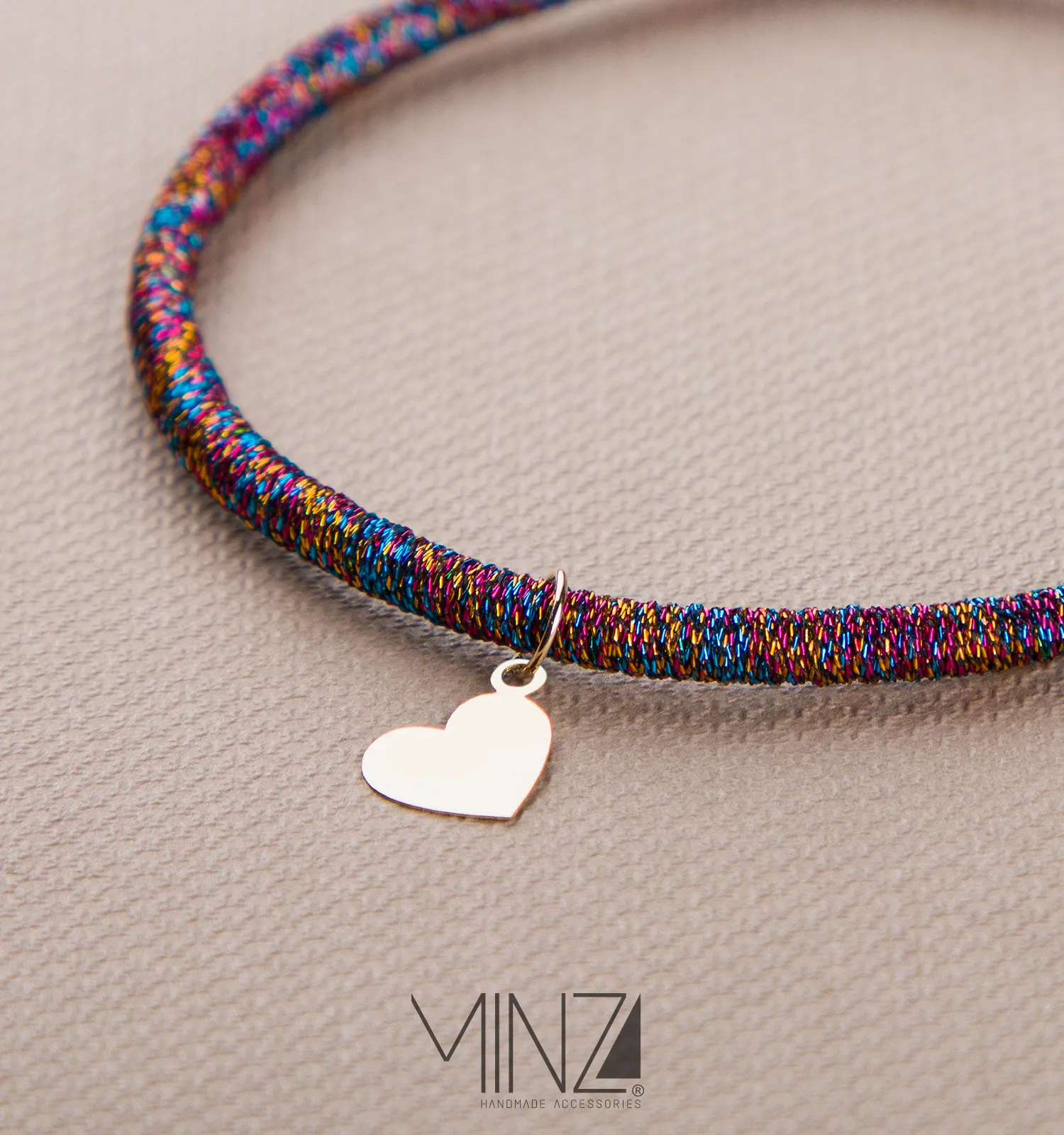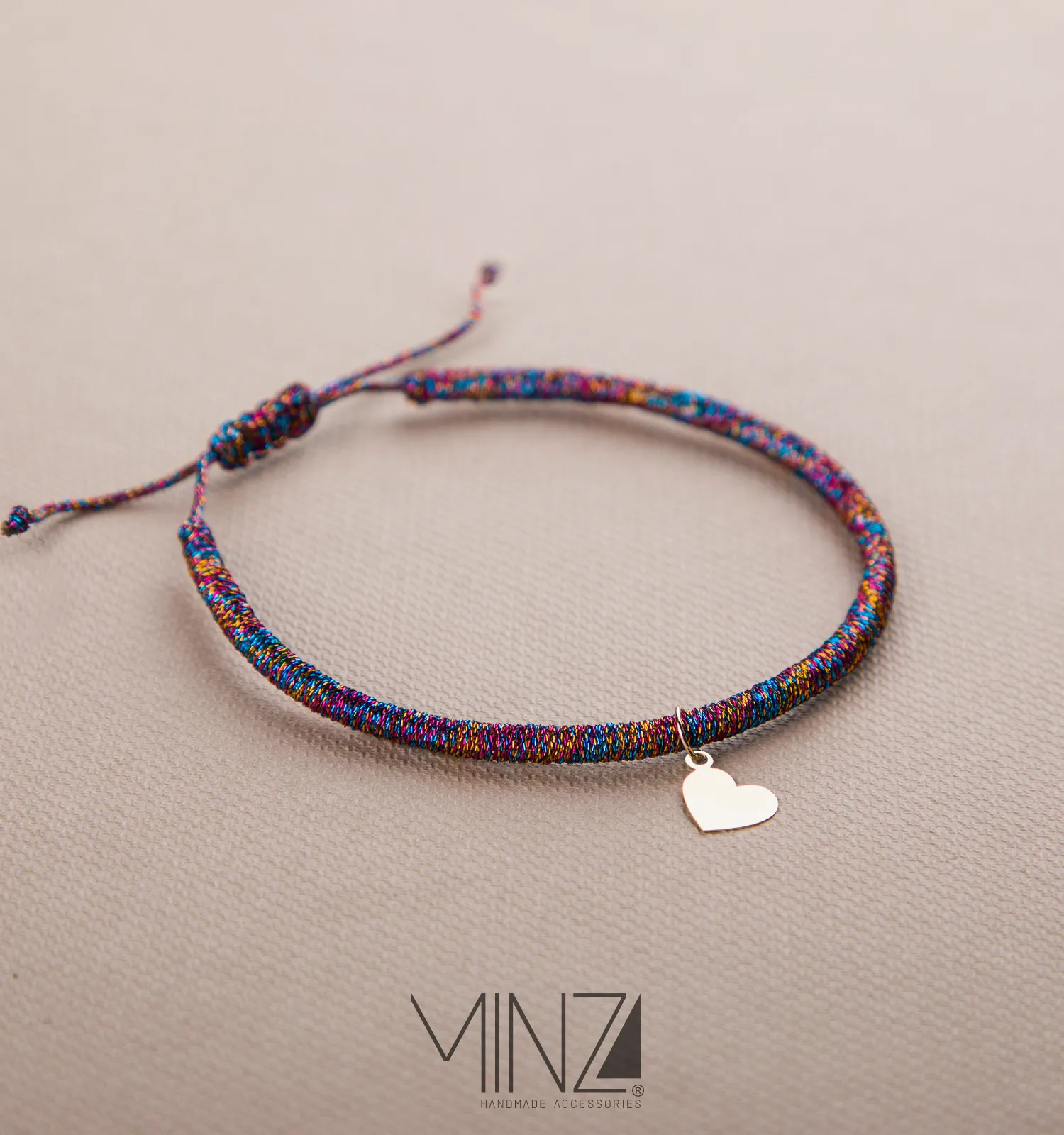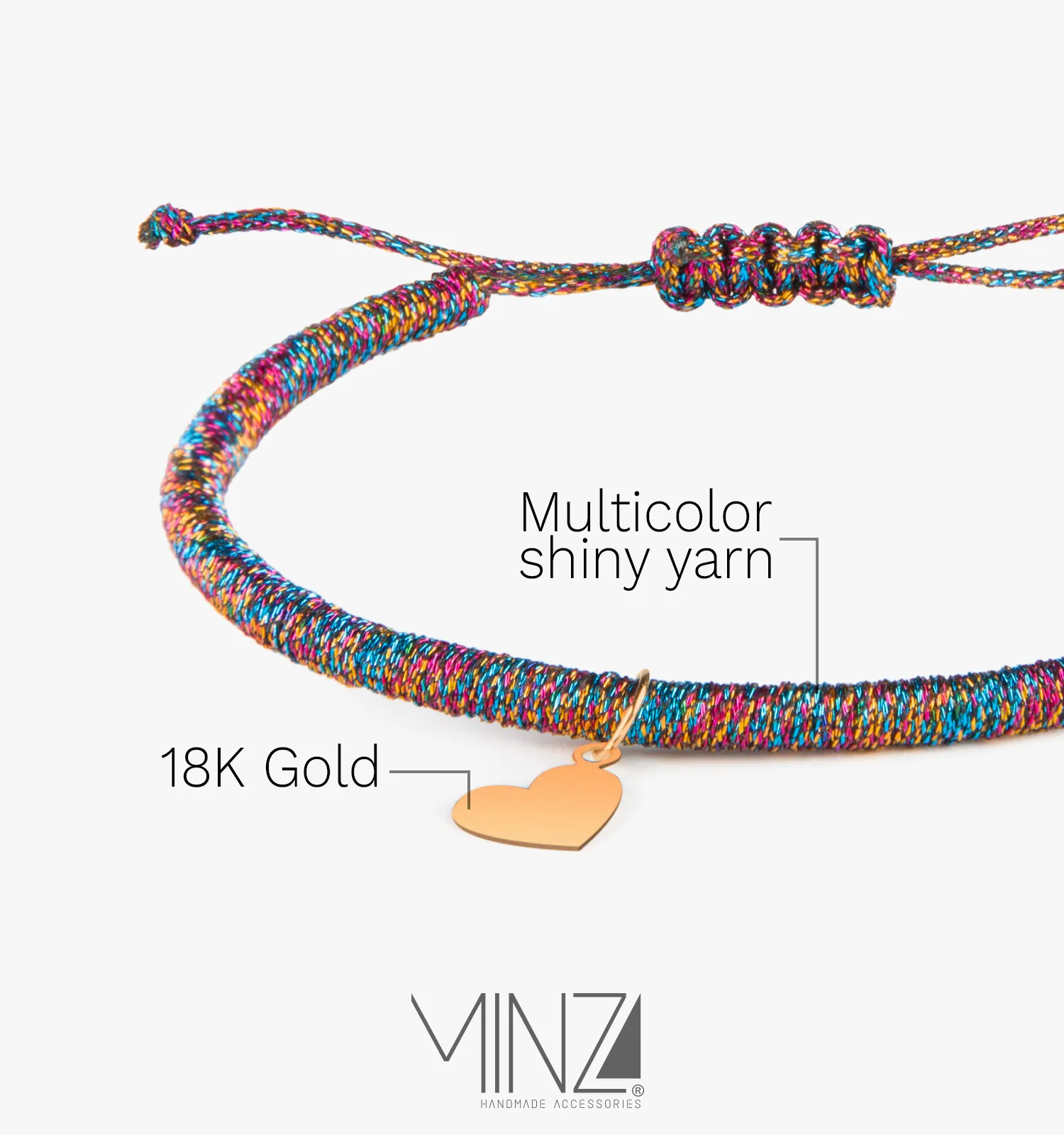 At the center of the bracelet rests a delicate 18K gold heart charm (8×8 mm, 0.220 g), glowing softly against a vibrant handwoven multicolored hemp cord. The heart symbolizes warmth, affection, and emotional connection, while the shimmering threads add a lively and uplifting character to the design.