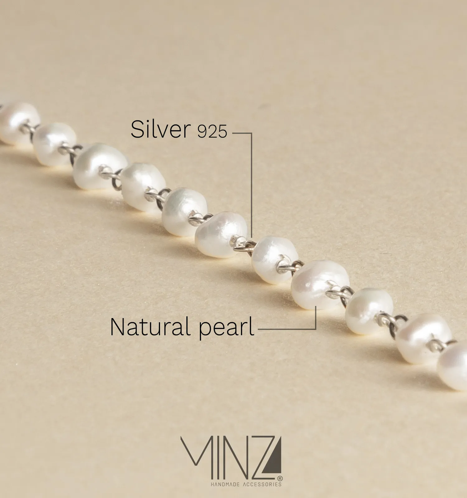 The design blends a delicate silver chain with evenly spaced natural pearls, creating a harmonious rhythm of shine and softness along the neckline. Each pearl brings its own unique glow, reflecting light with a subtle iridescence that has fascinated jewelry lovers for centuries. This elegant composition creates a piece that feels both classic and modern at the same time.