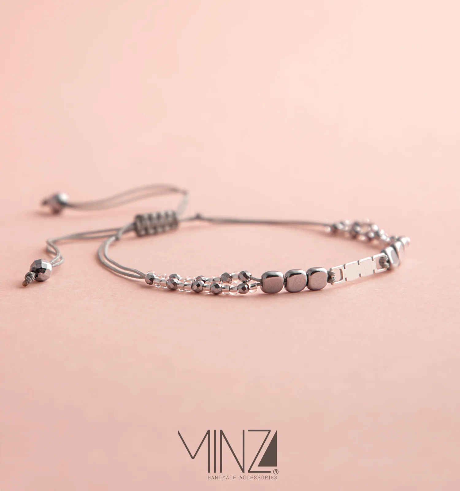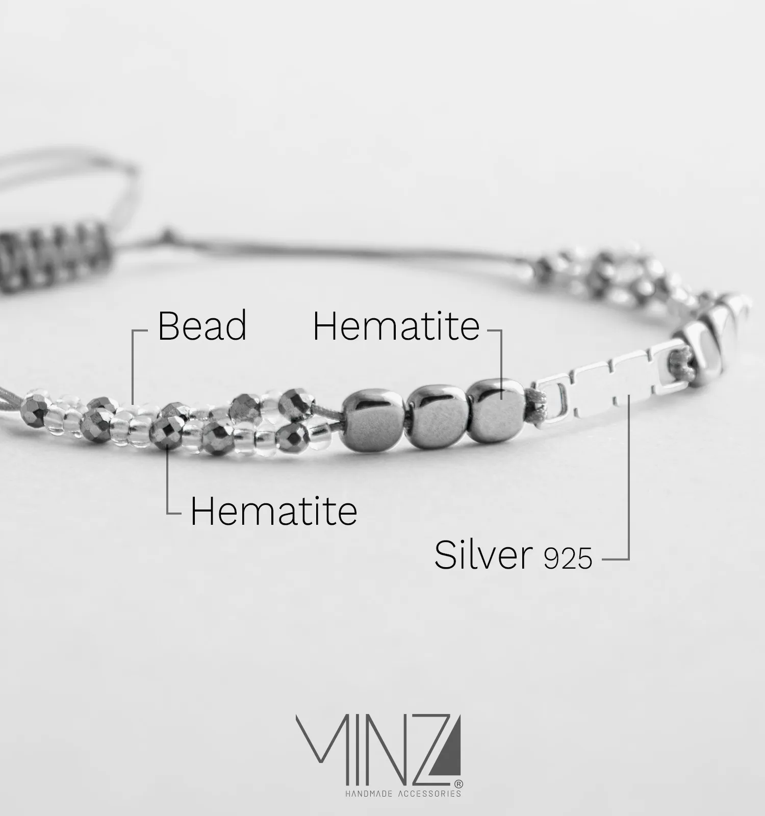 At the center of the bracelet lies a sleek square silver plaque, symbolizing stability, structure, and grounded confidence. The square — with its equal sides and balanced form — represents order, security, and inner strength. On both sides of the plaque, metallic hematite stones create a smooth reflective contrast, while two rows of fine Czech beads extend the design with subtle texture and refined detail.