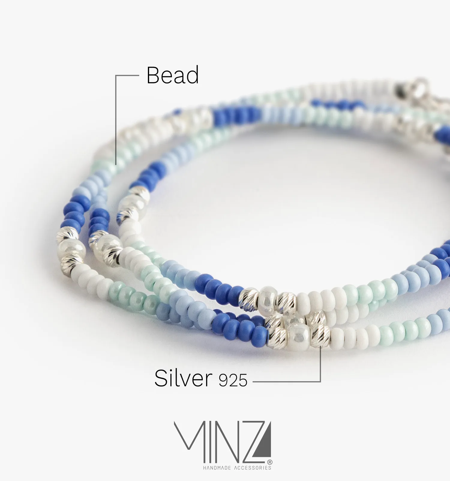 Named after the soothing color palette of its beads, “Wave” embodies the peaceful energy of the sea and the quiet confidence of modern femininity.